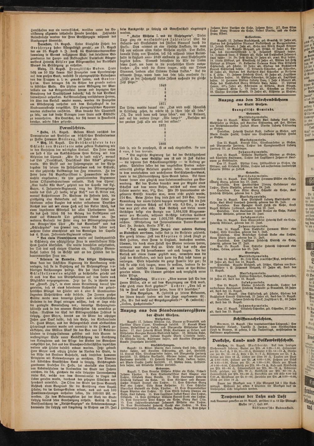 August: 7. Dem Bremser Wilhelm Köhler ein Sohn, Richard Johann Theodor. 9. Dem StattonSasststent Karl Wagner eine Tochter, Elisabeth Anna Aurelle. 10. Dem Kaufmann Heinrich Friedrich Nassauer ein Sohn. 10. Dem Kürschner und Kappenmacher Richard Frenzel eine Tochter. 11. Dem Schreiner Georg Beck eine Tochter, Elisa Anna Katharine. 11. Dem Schlaffer Marcellus GaltnSkt ein Sohn, Theodor. 12. Dem Brauereibesitzer Eugen Asprton eine Tochter. 12. Dem Wirth Ludwig Flamme ein Sohn, Karl Ludwig. 13. Dem Taglöhner Justus Sauer eine Tochter, Elisabeth. 14. Dem Hilfsheizer Wilhelm Konrad Preis eine Tochter. 14. Dem Vorarbeiter Peter Schepp ein Sohn, Georg Karl Otto. 15. Dem Zahlmeisteraspirant Johannes Wilhelm eine Tochter. 15. Dem Vtcefeldwebel Heinrich Specht eine Tochter. 15. Dem HülfSbremser Heinrich Wilker eine Tochter, Auguste. 16. Dem Heizer