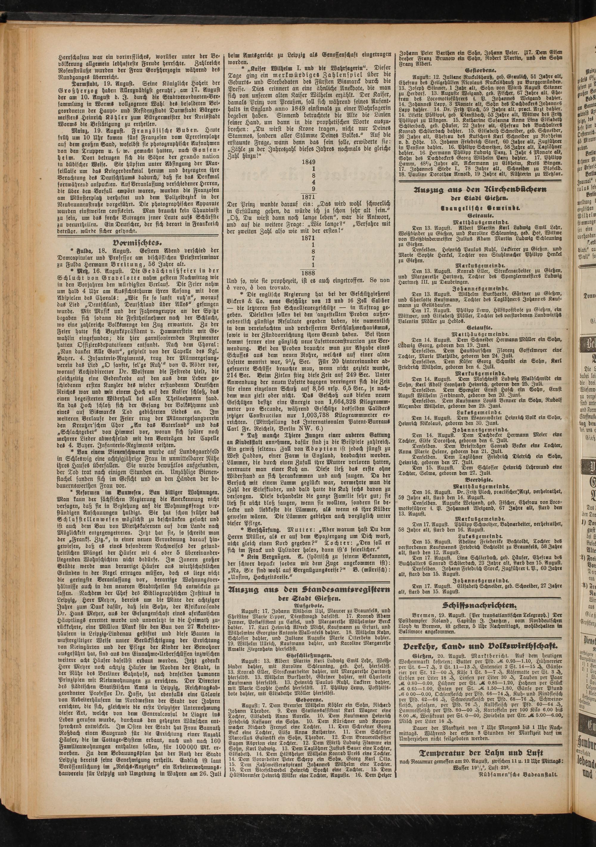 Den 17. August. Philipp Lemp, Hilfspostbote zu Gießen, ein Wittwer, und Elisabeth Möller, Tochter deS verstorbenen Landwirth» Valentin Möller zu Heblo».