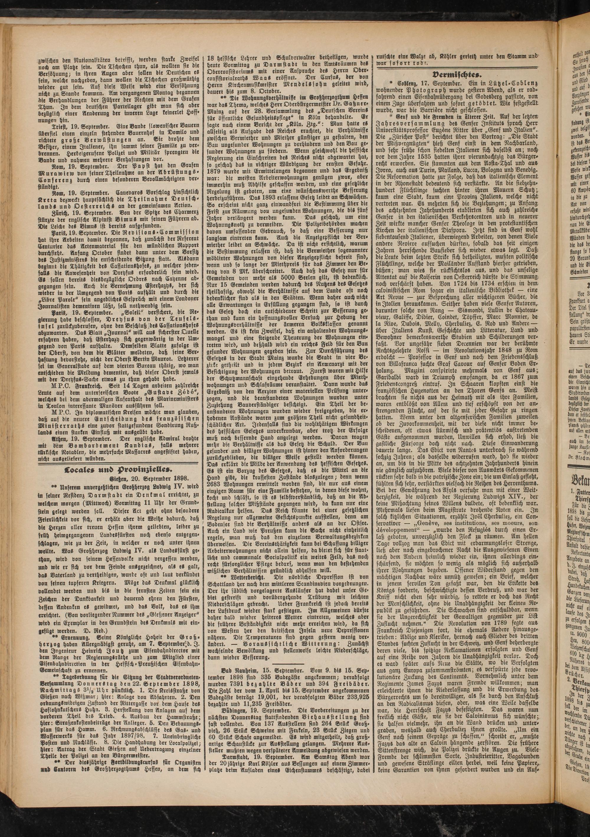 * * Tagesordnung für die Sitzung der Stadtverordneten- verfammlnng Donnerstag den 22. September 1898, Nachmittags 31/, Uhr pünktlich. 1. Dte Kretsstraße von Gießen nach Wißmar- hier: Anlage von Abfahrten. 2. Den ordnungswidrigen Zustand der Rittergaffe vor dem Hause de- Hoflohnkutscher» Huhn. 3. Herstellung von Anlagen auf dem vorderen Theil drs Trieb. 4. Ausbau der Hammstraße; hier: Straßenkostenbeiträge der Anlieger. 5. Den Bebauung«, plan für da» Hamm. 6. RechnungSabschlüffe des GaS- und WafferwerkS für da» Jahr 1897/98. 7. Uneinbringliche Posten und Nachläffr. 8. Die Handhabung der Localpolizei- hier: Antrag der Stadt Gießen auf Uebertragung einzelner Theile der Polizei an den Bürgermeister.