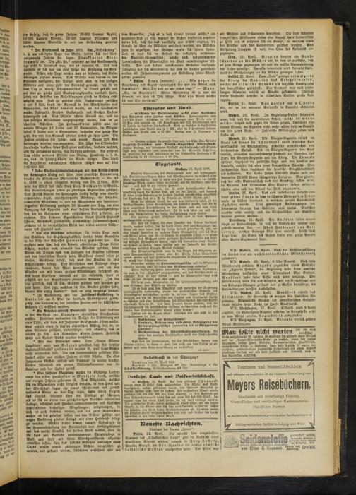 Petersburg, 21. April- Die Kaiserin leider neuer, dingö au Seitenstechen, so daß die Ausfahrten wieder eingestellt worden sind. — Fürst Ferdinand von Bulgarien, welcher Anfangs Mai hier eintrifft, bleibt drei Tage hier. Zu Ehren des Gaste» findet eine große Parade aller Garde Regimenter statt.