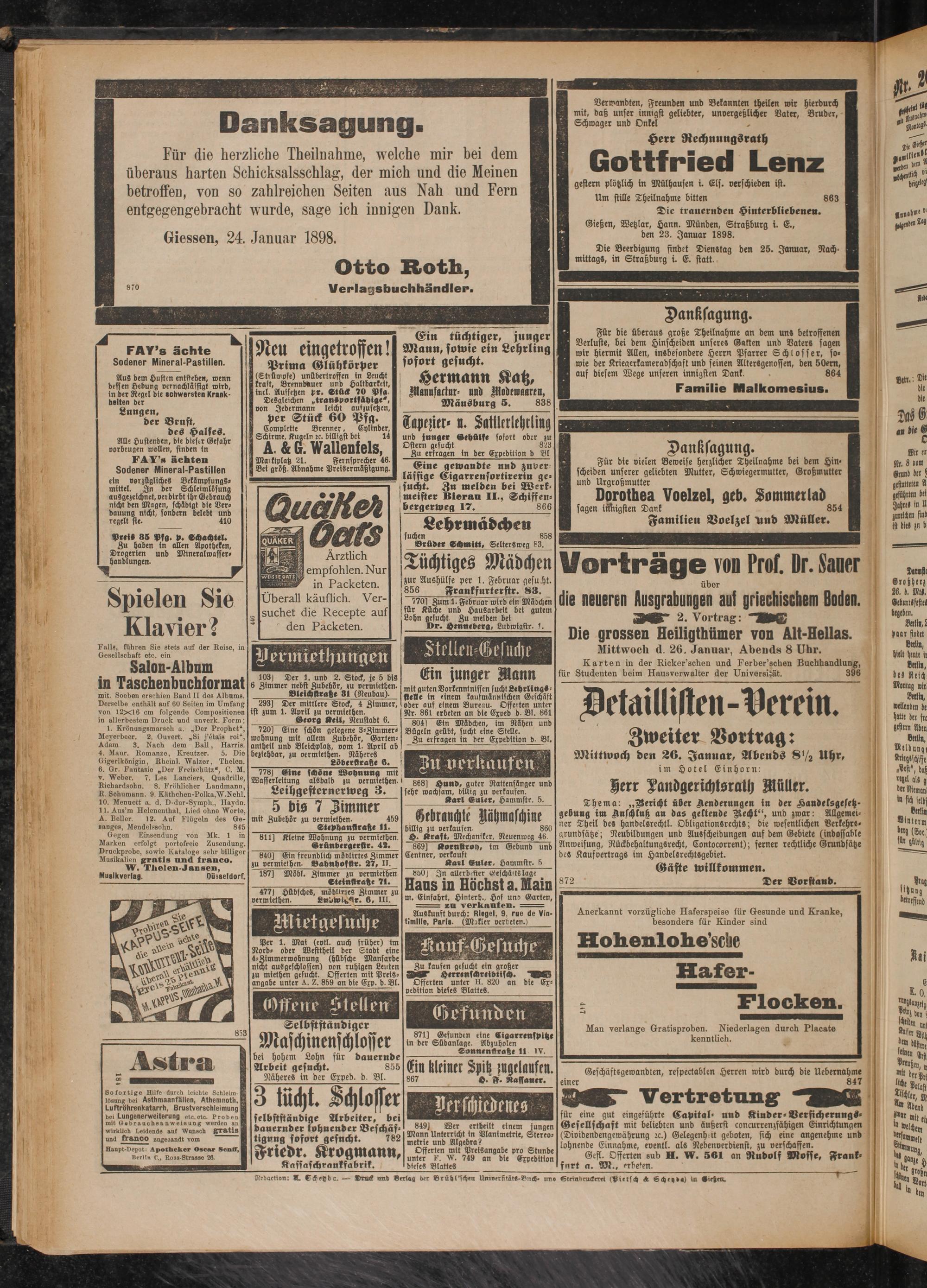 Gießen, Wetzlar, Hann. Münden, Straßburg i. E., den 23. Januar 1898.