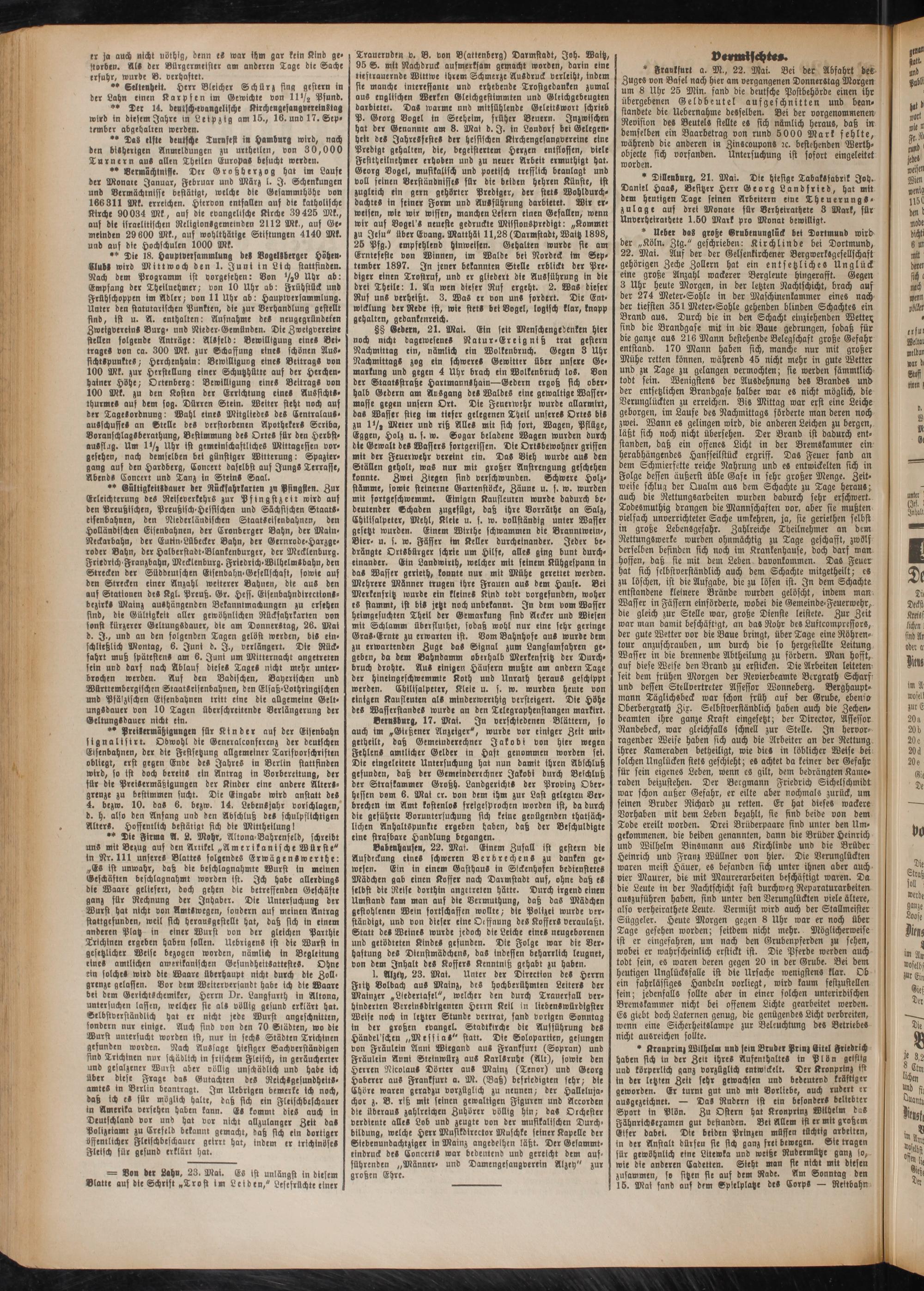 * Ueber das große Grubenunglück bei Dortmund wird der „Köln. Ztg." geschrieben: Kirch linde bei Dortmund, 22. Mai. Auf der der Gelsenkirchener BergwerkSgesellschaft gehörigen Zeche Zollern hat ein entsetzliches Unglück eine große Anzahl wackerer Bergleute hingerafft. Gegen 3 Uhr heute Morgen, in der letzten Nachtschicht, brach aus der 274 Meter-Sohle in der Maschinenkammer eines nach der tiefsten 351 Meter-Sohle gehenden blinden Schachtes ein Brand aus. Durch die in den Schacht einziehenden Wettes sind die Brandgase mit in die Baue gedrungen, sodaß für die ganze aus 216 Mann bestehende Belegschaft große Gefahr entstand. 170 Mann haben sich, manche nur mit großer Mühe retten können, während 45 nicht mehr in gute Wetter und zu Tage zu gelangen vermochten; sie werden sämmtlich tobt sein. Wenigstens der Ausdehnung des Brandes und der entsetzlichen Brandgase halber war es nicht möglich, die Verunglückten zu erreichen. Bis Mittag war erst eine Leiche geborgen, im Laufe des Nachmittags förderte man deren noch zwei. Wann es gelingen wird, die anderen Leichen zu bergen, läßt sich noch nicht übersehen. Der Brand ist dadurch entstanden, daß ein offenes Licht in der Bremskammer ein herabhängendes Hanfseilstück ergriff. Das Feuer fand an dem Schmierfette reiche Nahrung und es entwickelten sich in Folge dessen äußerst üble Gase in sehr großer Menge. Zeitweise schlug der Qualm aus dem Schachte zu Tage heraus; auch die Rettungsarbeiten wurden dadurch sehr erschwert. Todesmuthig drangen die Mannschaften vor, aber sie mußten vielfach unverrichteter Sache umkehren, ja, sie geriethen selbst in große Lebensgefahr. Zahlreiche Theilnehmer an dem Nettungswerke wurden ohnmächtig zu Tage geschafft, zwölf derselben befinden sich noch im Krankenhause, doch darf man hoffen, daß sie mit dem Leben davonkommen. Das Feuer hat sich selbstverständlich auch dem Schachte mitgetheilt; cs zu löschen, ist die Aufgabe, die zu lösen ist. In dem Schachte entstandene kleinere Brände wurden gelöscht, indem man Waffer in Fässern einförderte, wobei die Gemeinde-Feuerwehr,- die gleich zur Stelle war, große Dienste leistete. Zur Zeit war man damit beschäftigt, an das Rohr des Luftcompressors, der gute Wetter vor die Baue bringt, über Tage eine Röhren- tour anzuschrauben, um durch die so hergestellte Leitung Wasser in die brennende Abtheilung zu fördern. Man hofft, auf diese Weise den Brand zu ersticken. Die Arbeiten leiteten seit dem frühen Morgen der Revierbeamte Bergrath Schars und dessen Stellvertreter Assessor Wonneberg. Berghaupt- mann Täglichsbeck war schon früh auf der Grube, ebenso Oberbergrath Zix. Selbstverständlich haben auch die Zechenbeamten ihre ganze Kraft eingesetzt; der Director, Assessor Randebeck, war gleichfalls schnell zur Stelle. In hervorragender Weise haben sich auch die Arbeiter an der Rettung ihrer Kameraden betheiligt, wie dic- in löblicher Weise bei solchen Unglücken stets geschieht; es achtet da keiner der Gefahr für sein eigenes Leben, wenn es gilt, dem bedrängten Kameraden beizustehen. Der Bergmann Friedrich Sichelschmidt war schon außer Gefahr, er eilte aber nochmals zurück, um seinen Bruder Richard zu retten. Er hat dieses wackere Vorhaben mit dem Leben bezahlt, sie sind beide von dem Tode ereilt worden. Drei Brüderpaare sind unter den Umgekommenen. die beiden genannten, dann die Brüder Heinrich und Wilhelm Binsmann aus Kirchlinde und die Brüder Heinrich und Franz Wüllner von hier. Die Verunglückten waren meist Häuer, es befanden sich unter ihnen aber auch vier Maurer, die mit Maurerarbeiten beschäftigt waren. Da die Leute in der Nachtschicht fast durchweg Reparaturarbeiten auszuführen haben, sind unter den Verunglückten viele ältere, also verheirathete Leute. Vermißt wird auch der Stallmeister Süggeler. Heute Morgen gegen 8 Uhr war er noch über Tage gesehen worden; seitdem nicht mehr. Möglicherweise ist er eingefahren, um nach den Grubenpferden zu sehen, wobei er wahrscheinlich erstickt ist. Die Pferde werden auch tobt sein, es waren deren gegen 20 in der Grube. Bei dem heutigen Unglücksfalle ist die Ursache wenigstens klar. Ob ein fahrlässiges Handeln vorliegt, wird kaum festzustellen sein; jedenfalls sollte aber in einer solchen unterirdischen Bremskammer nicht bei offenem Lichte gearbeitet werden. Es giebt doch Laternen genug, die genügendes Licht verbreiten, wenn eine Sicherheitslampe zur Beleuchtung des Betriebes nicht ausreichen sollte.