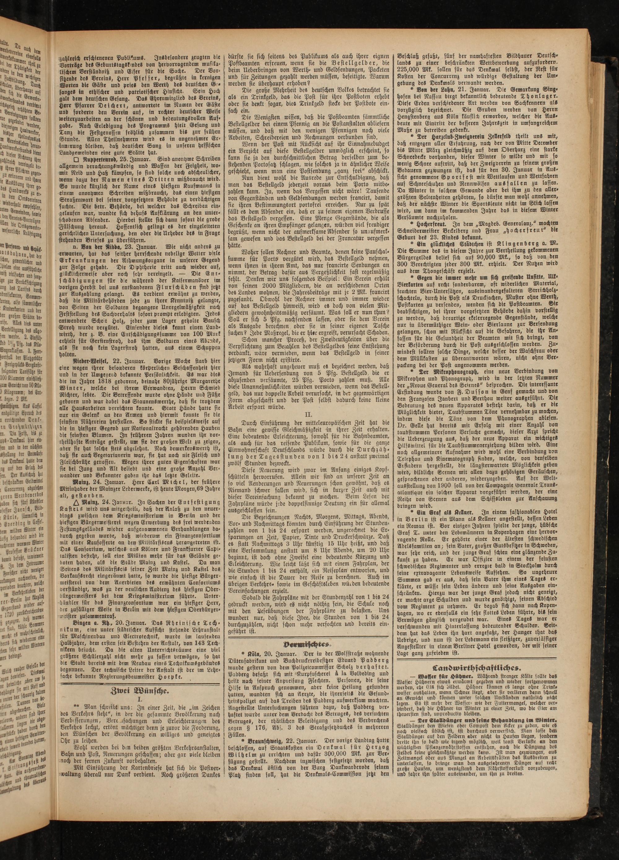 Als wahrhaft ungeheuer muß es bezeichnet werden, daß Jemand für Uebersendung von 5 Pfg. Bestellgeld, die er abzusenden versäumte, 25 Pfg. Porto zahlen muß. Alle diese Unannehmlichkeiten würden vermieden, wenn das Bestellgeld, das nur doppelte Arbeit verursacht, in der gegenwärtigen Form abgeschafft und der Post selbst dadurch keine kleine Arbeit erspart würde.
