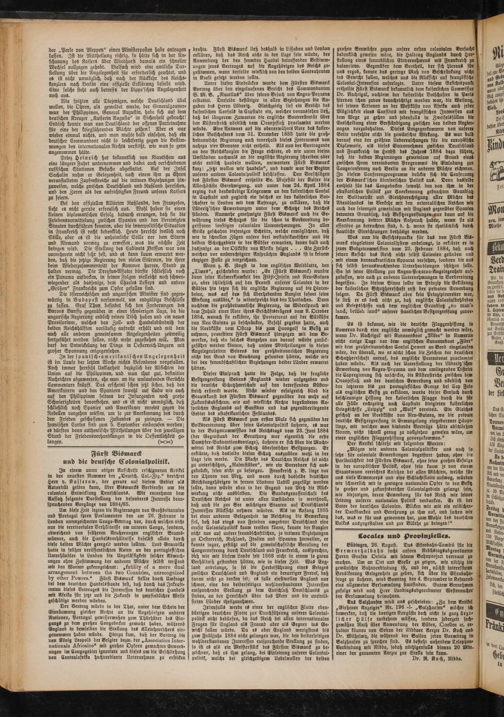 „Mögen wir anderen Colontalpolitiker uns noch so sehr für coloniale Erwerbungen begeistert haben, ohne die Persönlichkeit des Fürsten BiSmarck, ohne seine großen Erfolge in der europäischen Politik, ohne fein kaum je von einem Staatsmann erreichtes Ansehen bei allen Mächten, welche sür uns viele Armeecorp» und eine Schlachtflotte aufwog, würden wir schwerlich mit so geringen nationalen Opfer in den Besitz so großer und zukunftsreicher Colonialgebiete gelangt sein, wie diejenigen, deren Erwerbung für das Reich wir seiner Leitung unserer nationalen Politik verdanken. Er ist der Vater der deutschen Colonien. Blicken wir mit nie erlöschender Dankbarkeit und Verehrung zu ihm auf, und suchen wir das, wa» er für uv« gewonnen hat, zum Wohle des deutsche» Volke» auszugestalten und zur Blüthe zu bringen!“