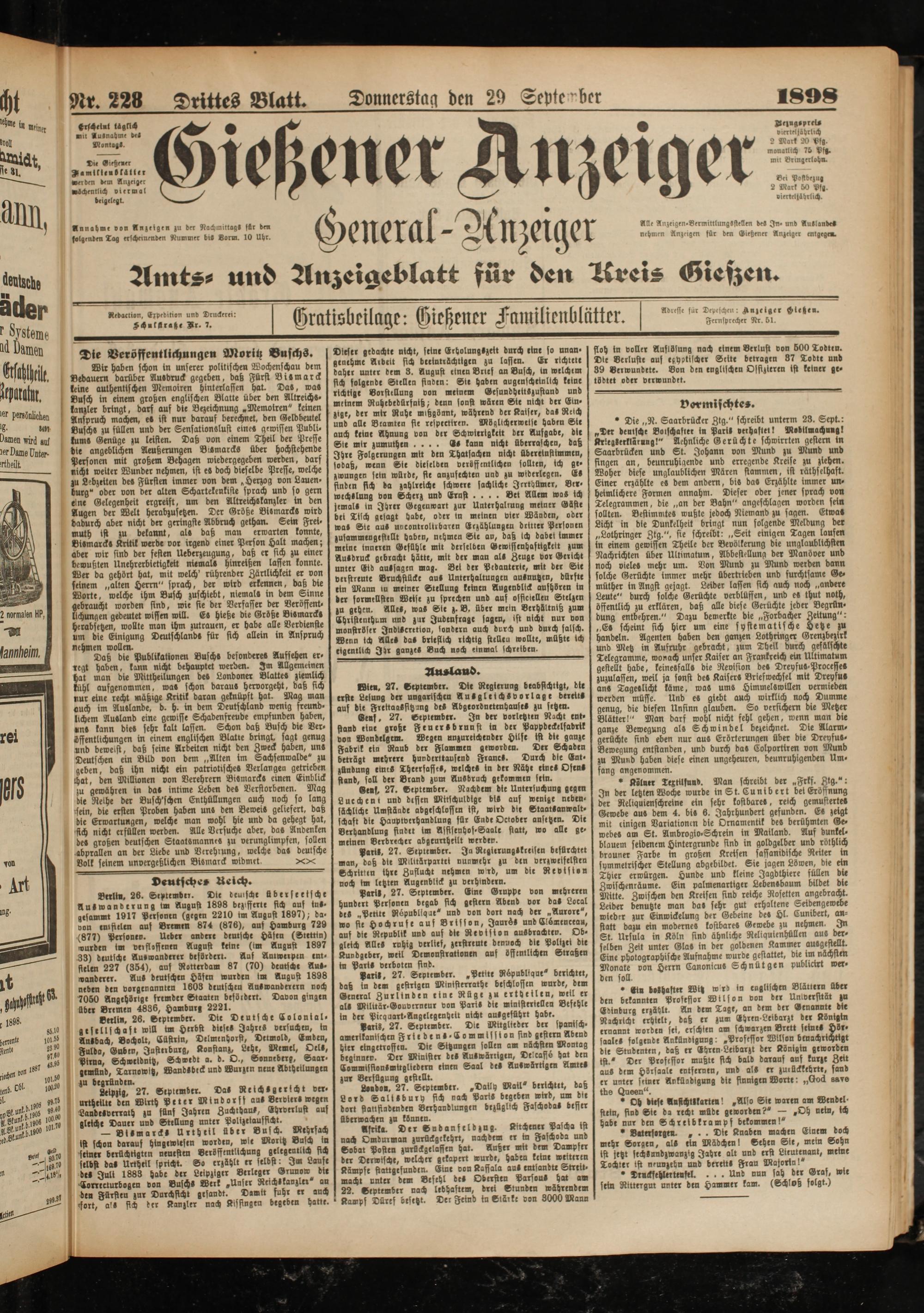 — Bismarck« Urtheil über Busch. Mehrfach ist schon darauf hingewieseu worden, wie Moritz Busch in seiner berüchtigten neuesten Veröffentlichung gelegentlich fich selbst da« Urtheil spricht. So erzählt er selbst: I« Laufe de« Juli 1883 habe der Leipziger Verleger Grünow die Correcturbogen von Busch« Werk »Uafer Reichskanzler an den Fürsten zur Durchsicht gesandt. Damir fuhr et and । (fort, a!« fich der Kanzler nach Kisfiogen begeben hatte.