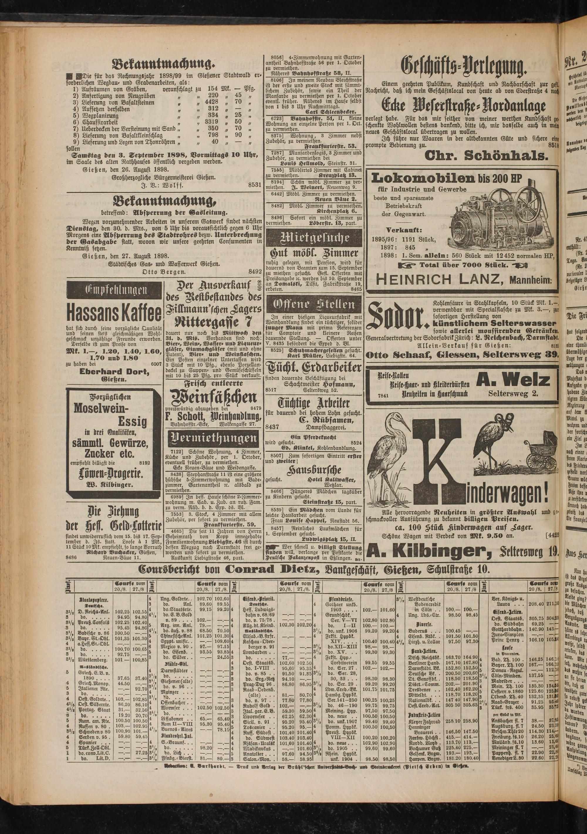 Samstag bett 3. September 1898, Vormittags 10 Uhr, im Saale des alten Rathhauses öffentlich vergeben werden.