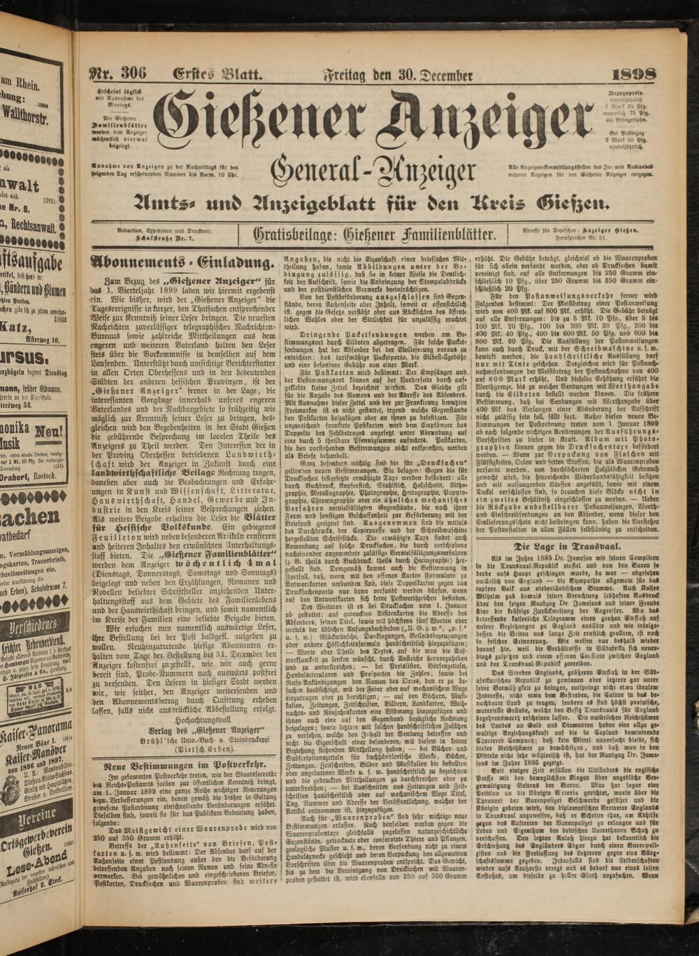 Sum Bezug des „Giefzener Anzeige^ für 'oaS 1. Vierteljahr 1899 laden wir hiermit ergebens! ^riu. Wie bisher, wird der „Gießener Anzeiger" die Tagesereignisse in kurzer, den Thatsachen entsprechender Weise zur Kenntniß seiner Leser bringen. Die neuesten Nachrichten zuverlässiger telegraphischer Nachrichten- Bureaus sowie zahlreiche Mitteilungen aus dem engeren und weiteren Vaterland halten den Leser stets über die Vorkommnisse in demselben auf dem Laufenden. Unterstützt durch umsichtige Berichterstatter in allen Orten Oberhessens und in den bedeutenden Städten der anderen hessischen Provinzen, ist der „Gießener Anzeiger" ferner in der Lage, die interessanten Vorgänge innerhalb unseres engeren! Vaterlandes und der Nachbargebiete so frühzeitig wie möglich zur Kenntniß seiner Leser zu bringen, desgleichen wird den Begebenheiten in der Stadt Gießen die gebührende Besprechung im localen Theile des Anzeigers zu Theil werden. Den Interessen der in der Provinz Oberhessen betriebenen Landwirth- schast wird der Anzeiger in Zukunft durch eine Landwirthschastliche Beilage Rechnung tragen, daneben aber auch die Beobachtungen und Erfahrungen in Kunst und Wissenschaft, Litteratur, Hauswirthschaft, Handel, Gewerbe und Industrie in den Kreis seiner Besprechungen ziehen. Als weitere Beigabe erhalten die Leser die Blätter für Hessische Volkskunde Ein gediegenes Feuilleton wird neben besonderen Artikeln ernsteren nnd heiteren Inhaltes den erwünschten llnterhaltungs- stoff bieten. Die „Gießener Familienblätter" werden dem Anzeiger wöchentlich 4 mal (Dienstags, Donnerstags, Samstags und Sonntags) beigelegt und neben den Erzählungen, Romanen und Novellen beliebter Schriftsteller anziehenden Unterhaltungsstoff aus dem Gebiete des Familienlebens und der Hauswirthschast bringen, und somit namentlich im Kreise der Familien eine beliebte Beigabe bieten.
