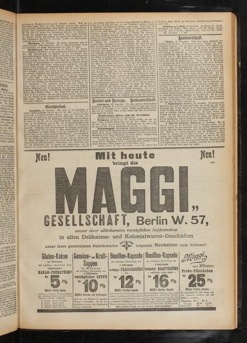 MftGGl’s Bouillon-Kapseln für Kraftbrühe enthalten extra stark konzentrierten entfetteten Fleischsaft von feinstem Auszug und sind äusser für körperlich und geistig stark Angestrengte besonders wertvoll auch für Kranke und Genesende.