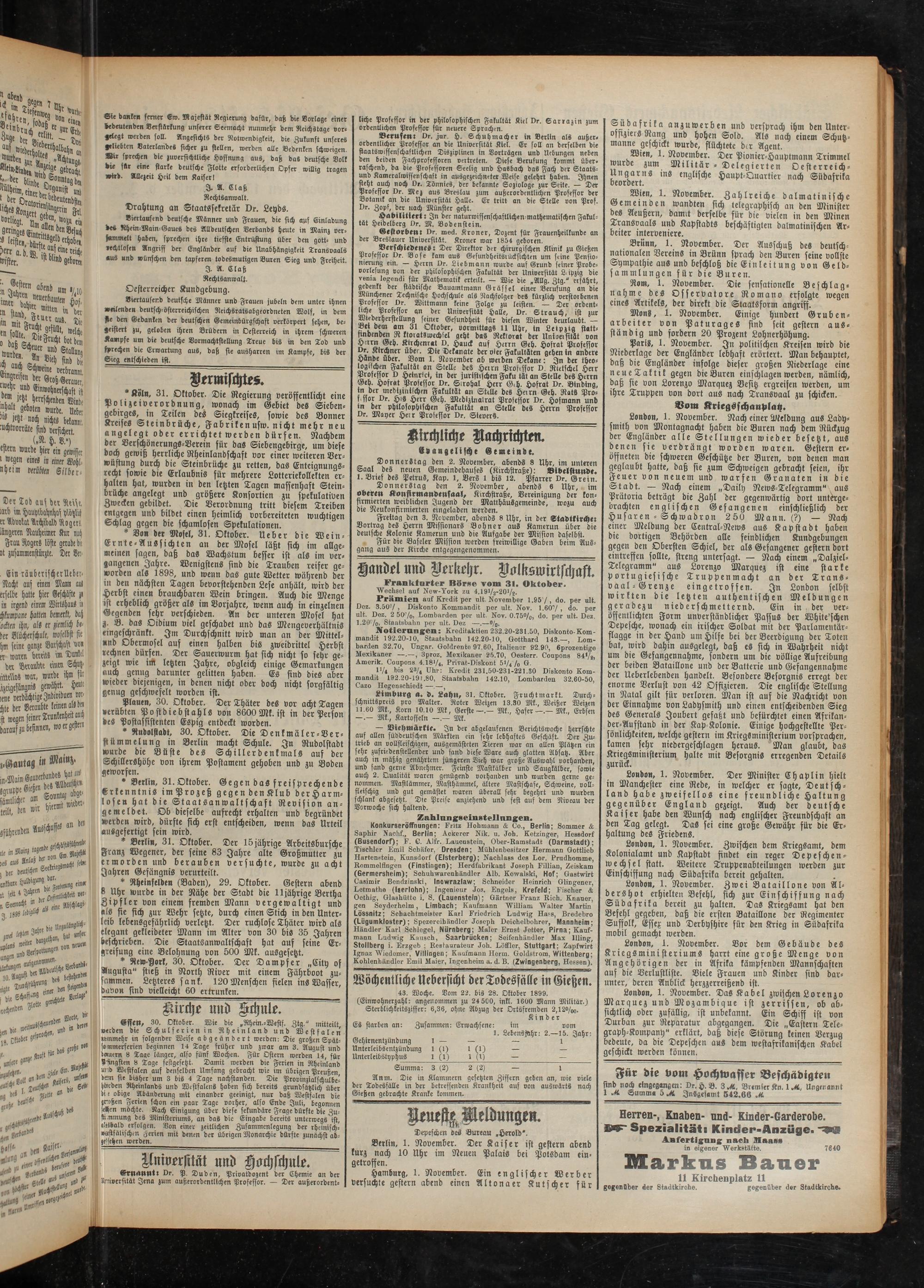 Konkurseröffnungen: Fritz Hohmann & Co., Berlin; Sommer & Saphir Nachf., Berlin; Ackerer Nik. u. Job. Ketzinger, Hessdorf (Busendorf); F. C. Alfr. Lauenstein, Ober-Ramstadt (Darmstadt); Tischler Emil Schäfer, Dresden; Mühlenbesitzer Hermann Gottlieb Hartenstein, Künsdorf (Elsterberg); Nachlass des Lor. Prudhomme, Rommelflngen (Einstiegen); Herdfabrikant Joseph Fillian, Zeiskam (Germersheim); Schuhwarenhändler Alb. Kowalski, Hof; Gastwirt Casimir Bendzinski, Inowrazlaw; Schneider Heinrich Glingener, Letmathe (leerlohn); Ingenieur Jos. Engels, Krefeld; Fischer & Oethig, Glashütte i. 8. (Lauenstein); Gärtner Franz Rich. Knauer, gen Seyderhelm, Limbach; Kaufmann William Walter Martin Lössnitz; Sohachtmeister Karl Friedrich Ludwig Hass, Bredebro (Lügumkloster); Spezereihändler Joseph Deicheibohrer, Mannheim; Händler Karl Schlegel, Nürnberg; Maler Ernst Jetter, Pirna; Kaufmann Ludwig Kausch, Saarbrücken; Seifenhändler Max Illing, stollberg i. Erzgeb ; Restaurateur Joh. Löffler, Stuttgart; Zapfwirt Ignaz Wiedomer, Villingen; Kaufmann Herrn. Goldstrom, Wittenberg; Kohlenhändler Emil Maier, Ingenheim a. d. B. (Zwingenberg, Hessen). Wöchentliche Üebersicht der Todesfälle in Gießen.