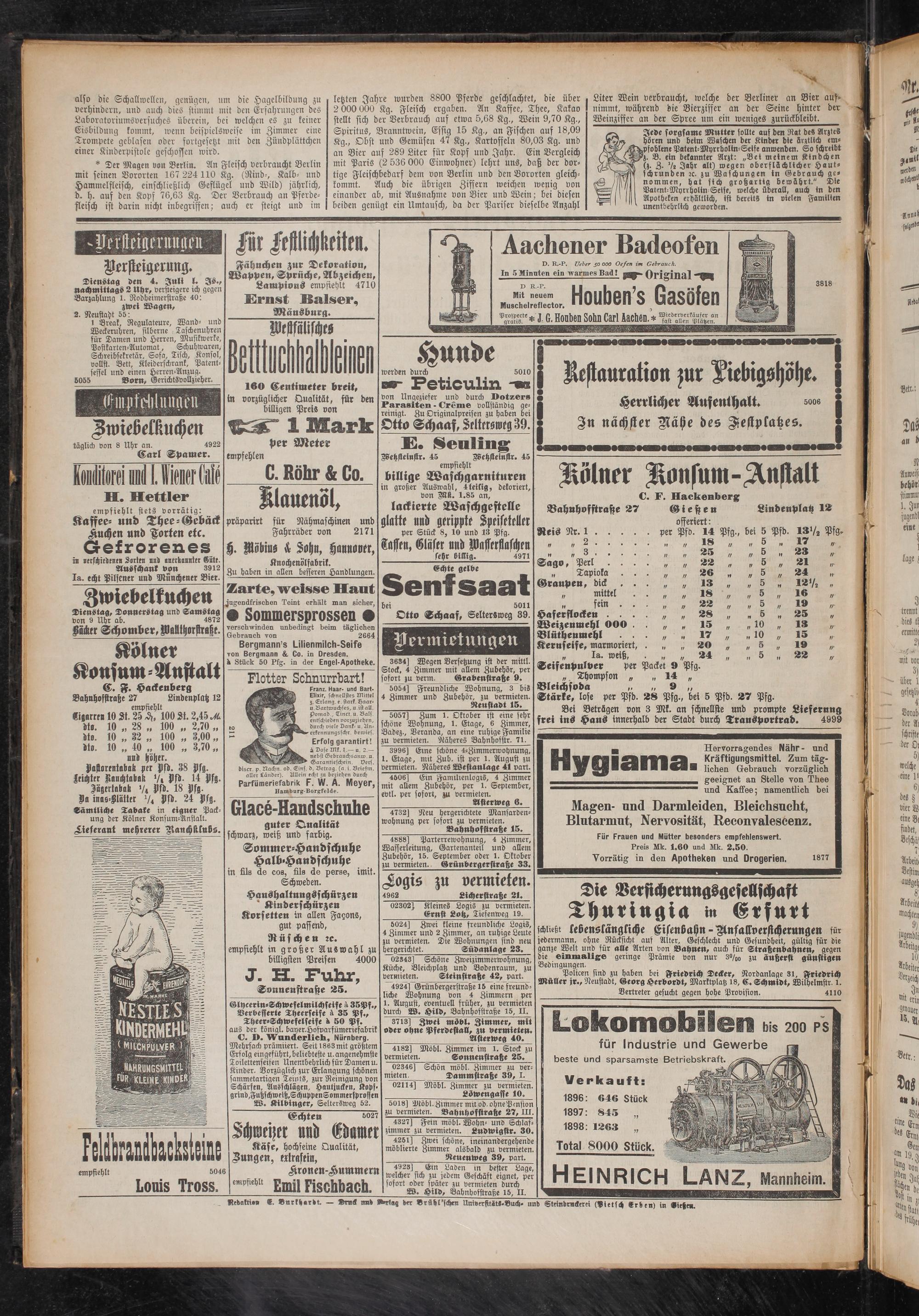 * Der Magen von Berlin. An Fleisch verbraucht Berlin mit seinen Vororten 167 224 110 Kg. (Rind-, Kalb- und Hammelfleisch, einschließlich Geflügel und Wild) jährlich, d. h. auf den Kopf 76,63 Kg. Der Verbrauch an Pferdefleisch ist darin nicht inbegriffen; auch er steigt und im