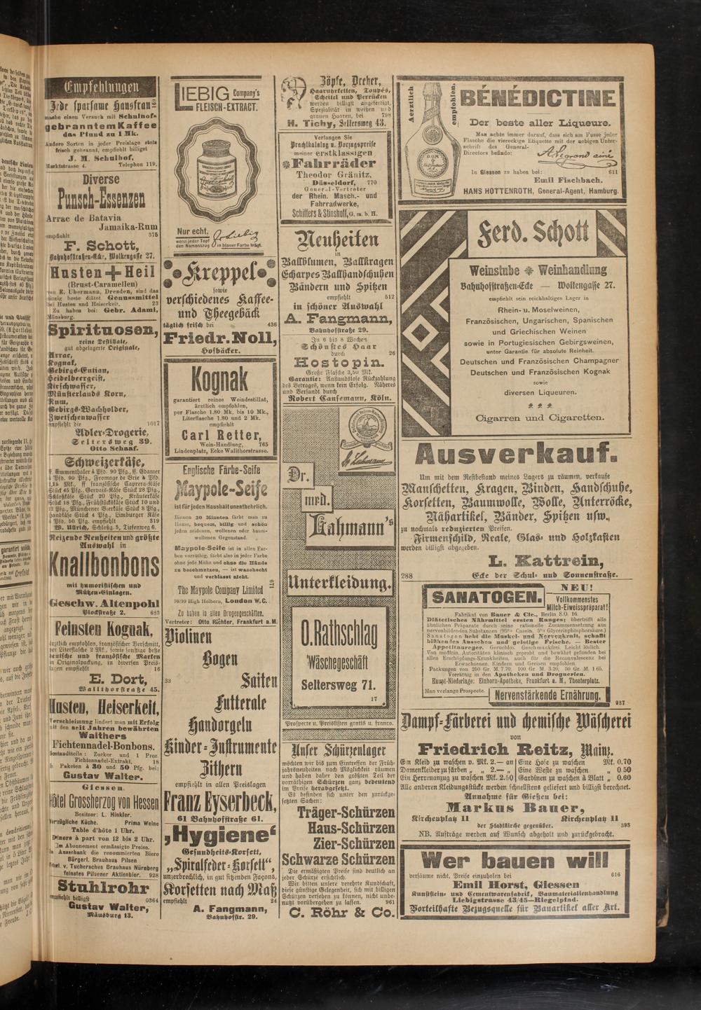 Feinstes Kognak, irztlick empfohlen, französischer Verschnitt, per Literflasche 2 Mk, sowie sonstige beste deutsche und französische Marken in Originalpackung, in diversen Preislagen empfiehlt 16