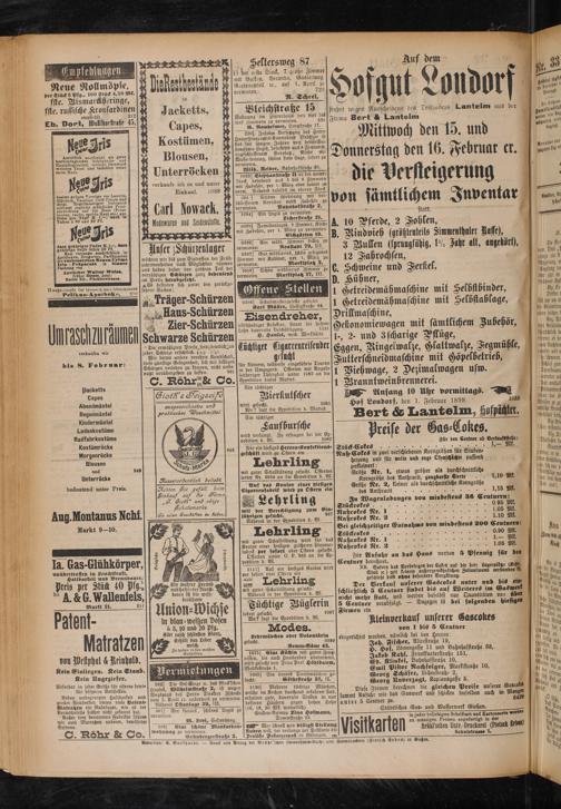 Wir bitten unsere verehrte Kundschaft, I diese günstige Gelegenheit, sich mit billigen Schürzen versehen zu können, nicht unbenutzt vorübergehen zu lasten. 961