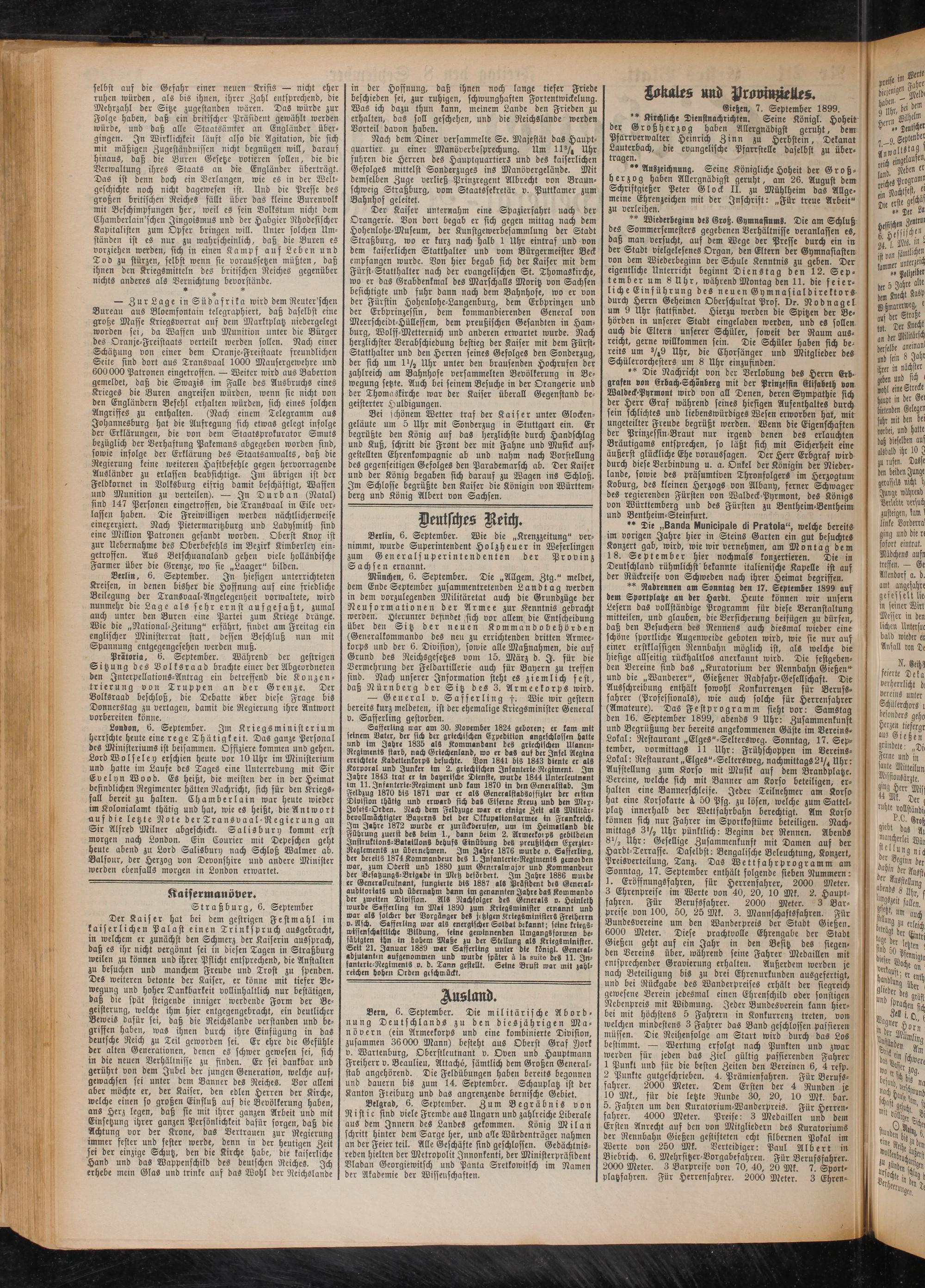 — Zur Lage in Südafrika wird dem Reuter'schen Bureau aus Bloemfontain telegraphiert, daß daselbst eine große Masse Kriegsvorrat auf dem Marktplatz niedergelegt worden sei, da Waffen und Munition unter die Bürger des Oranje-Freistaats verteilt werden sollen. Nach einer Schätzung von einer dem Oranje-Freiftaate freundlichen Seite sind dort aus Transvaal 1000 Mausergewehre und 600000 Patronen eingetroffen. — Weiter wird aus Baberton gemeldet, daß die Swazis im Falle des Ausbruchs eines Krieges die Buren angreifen würden, wenn sie nicht von den Engländern Befehl erhalten würden, sich eines solchen Angriffes zu enthalten. (Nach einem Telegramm aus Johannesburg hat die Aufregung sich etwas gelegt infolge der Erklärungen, die von dem Staatsprokurator Smuts bezüglich der Verhaftung Pakemans abgegeben worden sind, sowie infolge der Erklärung des Staatsanwalts, daß die Regierung keine weiteren Haftbefehle gegen hervorragende Ausländer zu erlassen beabsichtige. Im übrigen ist der Feldkornet in Volksburg eifrig damit beschäftigt, Waffen und Munition zu verteilen). — In Durban (Natal) sind 147 Personen eingetroffen, die Transvaal in Eile verlassen haben. Die Freiwilligen werden nächtlicherweise einexerziert. Nach Pietermaritzburg und Ladysmith sind eine Million Patronen gesandt worden. Oberst Knox ist zur Uebernahme des Oberbefehls im Bezirk Kimberley eingetroffen. Aus Betschuanaland gehen viele holländische Farmer über die Grenze, wo sie „Laager" bilden.