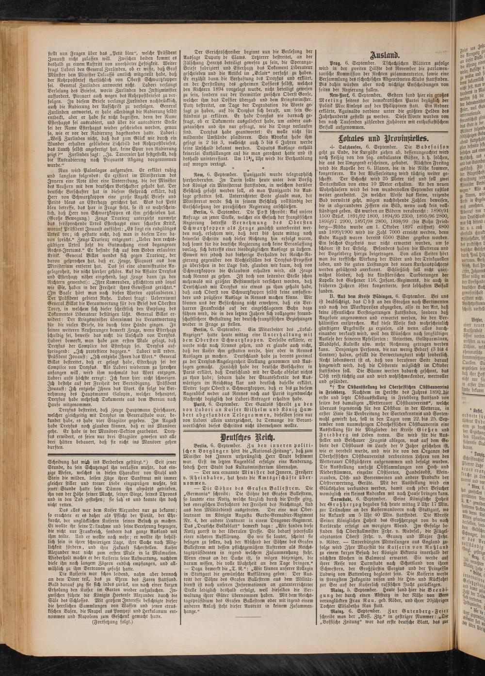 Berlin, 6. September. Die Post schreibt: Auf unsere Anfrage an jener Stelle, welcher ein Gesuch der französischen Regierung betreffs Vernehmung des Obersten Schwartzkoppen als Zeuge zunächst unterbreitet werden muß, erfahren wir, daß dort bis heute mittag noch keinerlei Schritte nach dieser Richtung hin erfolgt waren, daß somit für die deutsche Regierung auch keine Veranlassung vorlag, sich betreffs einer diesbezüglichen Aussage zu äußern. Soweit wir jedoch das bisherige Verhalten der Reichs-Regierung gegenüber den Wechselfällen des Dreyfus-Prozeffes zu übersehen in der Lage sind, glauben wir kaum, daß von Schwartzkoppen die Erlaubnis erhalten wird, als Zeuge nach Rennes zu gehen. Ist doch von leitender Stelle schon mehrmals mit größter Bestimmtheit versichert worden, daß Deutschland mit Dreyfus nie etwas zu thun gehabt habe, daß auch Oberst von Schwartzkoppen selbst keine umfassendere und präzisere Aussage in Rennes machen könne. Wir können uns der Befürchtung nicht erwehren, daß ein Verharren Frankreichs auf der eingeschlagenen Bahn dazu führen wird, die in den letzten Jahren sich vollzogene freundschaftlichere Gestaltung der deutsch-französischen Beziehungen wieder in Frage zu stellen.