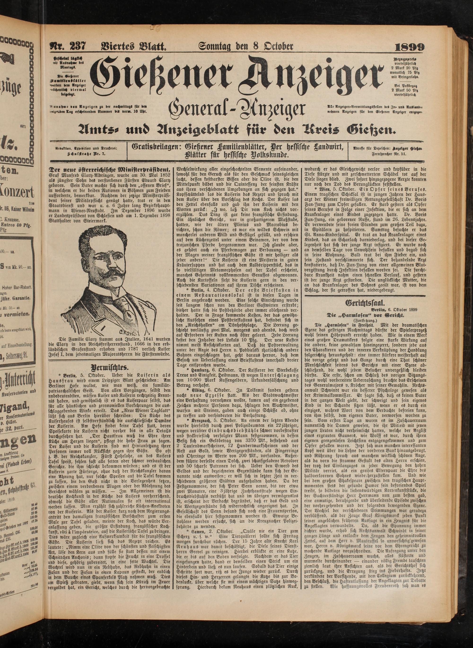 Der neue österreichische Ministerpräsident, Graf Manfred Clary Aldringen, wurde am 30. Mai 1852 als jüngster Sohn des verstorbenen Fürsten Eduard Clary geboren. Sein Vater machte sich durch den „offenen Brief", in welchem er die beiden Nationen in Böhmen zum Frieden aufforderte, bemerkbar. Nachdem der jetzige Ministerpräsident seiner Militärpflicht genügt batte, trat er in den Staatsdienst und war u. a. 6 Jahre lang Bezirkshauptmann in Wiener-Neustadt. Im Dezember 1896 wurde er Landespräsident von Schlesien und am 1. Dezember 1898 Statthalter von Steiermark.