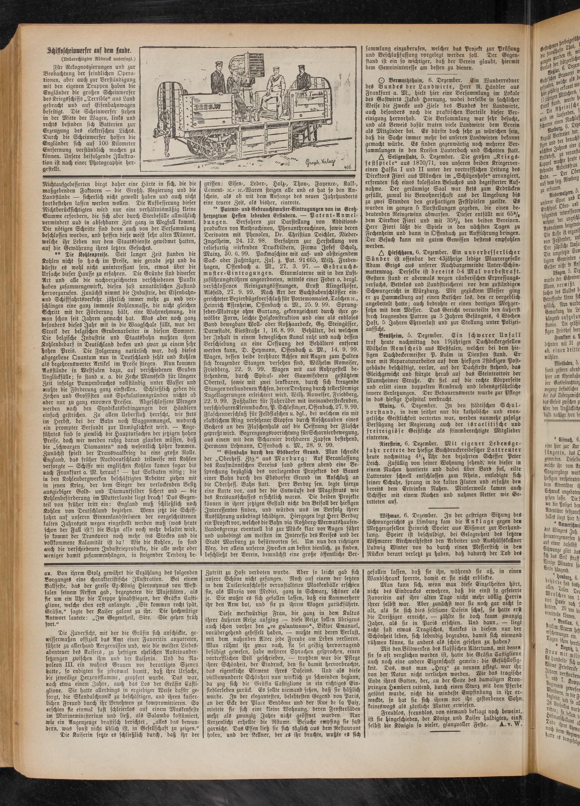 Für Rekognoszierungen und zur Beobachtung der feindlichen Operationen, aber auch zur Verständigung mit den eigenen Truppen haben die Engländer die großen Scheinwerfer des Kriegsschiffs „Terrible" ans Land gebracht und auf Eisenbahnwagen befestigt. Die Scheinwerfer stehen in der Mitte der Wagen, links und rechts befinden sich Batterien zur Erzeugung des elektrischeu Lichts. Durch die Scheinwerfer hoffen die Engländer sich auf 100 Kilometer Entfernung verständlich machen zu lkönnen. Unsere beifolgende Illustration ist nach einer Photographie hergestellt.
