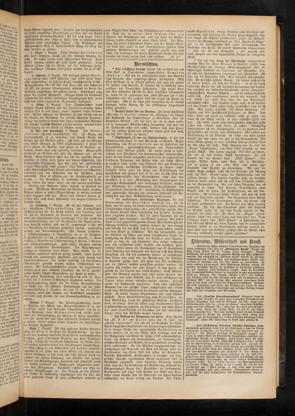 * Das Museum der Belagerung von Paris. Man schreibt den „M. N. N." aus Paris unter dem 24. Juli: Im „Musee Carnavalet“, das alle auf die Geschichte der Stadt Paris bezüglichen Gegenstände und Erinnerungen aufbewahrt, ist in voriger Woche eine eigentümliche Ausstellung eröffnet worden, die in vier Sälen alles vereinigt, was mit der Belagerung von Paris im Jahre 1870 zusammenhängt. Unter den Fahnen und Uniformstücken der Nationalgarde, zwischen Granaten und Waffen, ist ein zerschossener preußischer Helm aufbewahrt. An den Wänden vergegenwärtigen die Zeichnungen und Aquarelle von Pils und Clerget nebst den Karrikatnren von Andrö. Gill das Leben der Belagerten. Amtliche Schriftstücke, Passierscheine in deutscher und französischer Sprache, eigenhändige Briefe Gambettas sind in Glaskästen ausgestellt. Eine besondere Abteilung enthält alles, was für die Ernährung der Bevölkerung während der Belagerungszeit Bezug hat: Preislisten der Lebensmittel, Brodmarken, und sogar noch Proben von Mehl und Brod. Ueber einem Kamine sind die Ueberreste des letzten Ballons aufbewahrt, der Paris verließ, des Vauban. Die Töten
