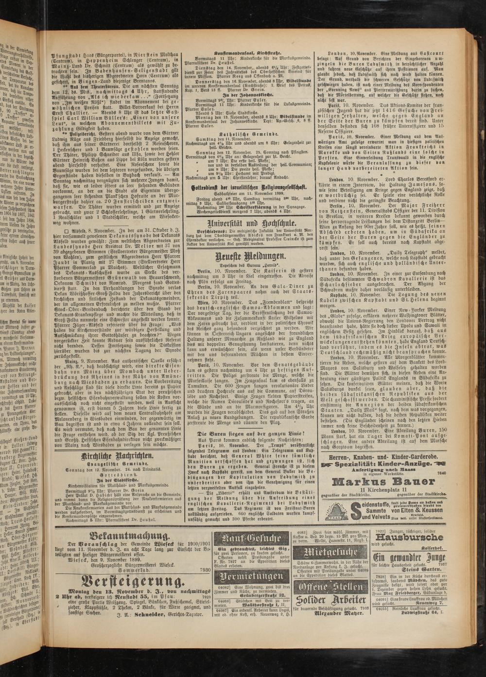 Donnerstag den 16. November, abends 8 Uhr, Bibelstunde im unteren Konfirmandensaal (Kirckstraße): 1. Brief des PetruS, Kap. 1, Vers 13 ff. Pfarrer Dr Grein.