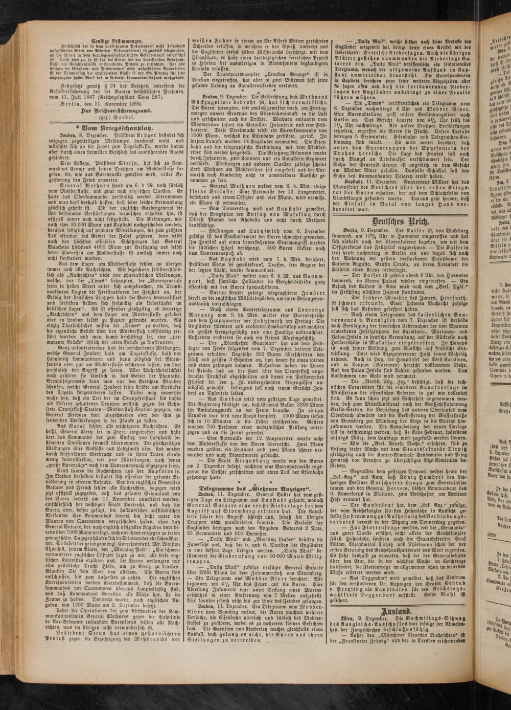 — Meldungen aus Ladysmith vom 6. Dezember zufolge ist das Bombardement der Buren schwächer geworden. Im Hinblick auf einen bevorstehenden Sturmangriff werden die südlichen Hügel verschanzt. 500 Buren rückten nach dorn Vanreenenspaß ab.