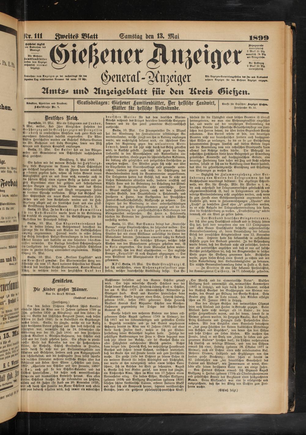 Adresse für Depeschen: Anzeiger Hieße«.