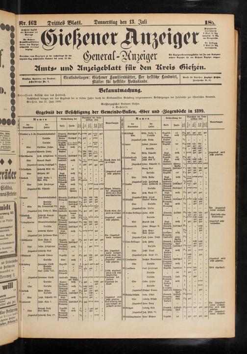 Nachstehend bringen wir das Ergebnis der in diesem Jahre durch die Körkommission Grünberg vorgenommenen Besichtigungen des Faselviehs zur öffentlichen Kenntnis.