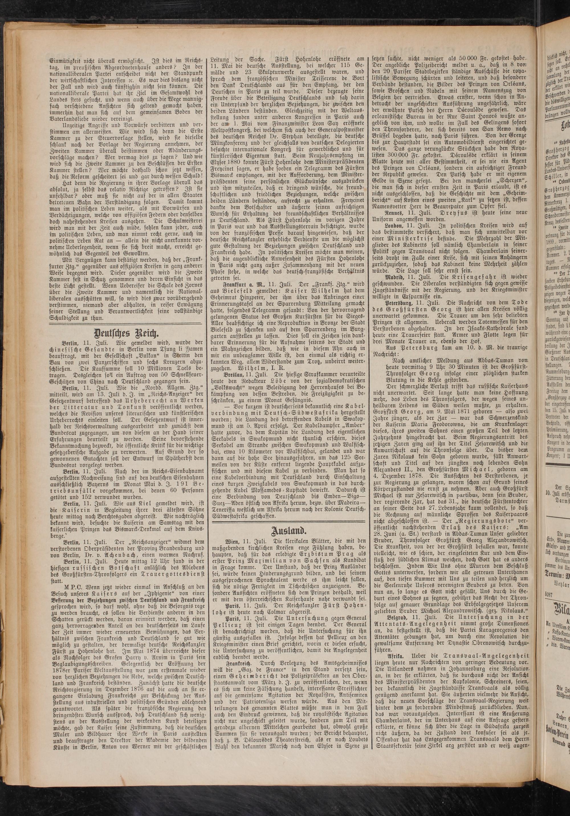 Paris, 11. Juli. Der Reichskanzler Fürst Hohenlohe ist heute nach Colmar abgereist.