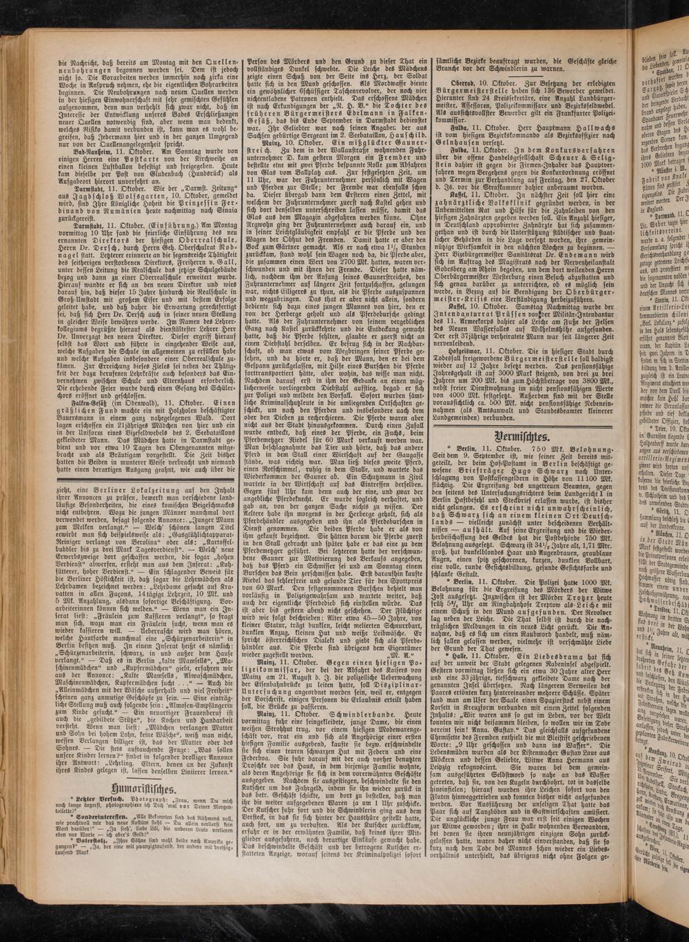 Falken Gesäß (im Odenwald), 11. Oktober. Einen gräßlichen Fund machte ein mit Holzholen beschäftigter Bauersmann in einem ganz nahegelegenen Wald. Dort lagen erschossen ein Lljähriges Mädchen von hier und ein in der Uniform eines Vizefeldwebels des 2. Seebataillons gekleideter Mann. Das Mädchen hatte in Darmstadt gedient und vor etwa 10 Tagen den Obengenannten mitgebracht und als Bräutigam vorgestellt. Die Zeit bisher halten die Beiden in munterer Weise verbracht und niemand hatte einen derartigen Ausgang geahnt, wie auch über die