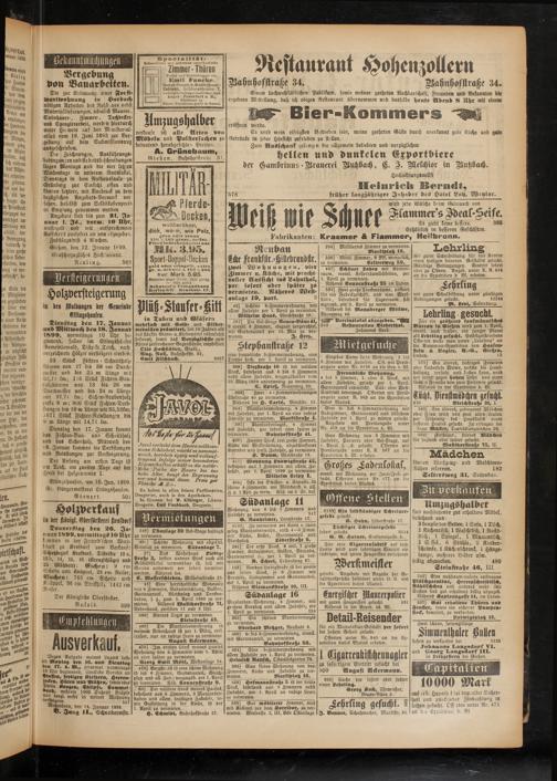 Einem bochwohllöblichen Publikum, sowie meiner geehrten Nachbarschaft, Freunden und Bekannten die ergebene Mitteilung, daß ich obiges Restaurant übernommen und dasselbe heute Abend 8 Uhr mit einem