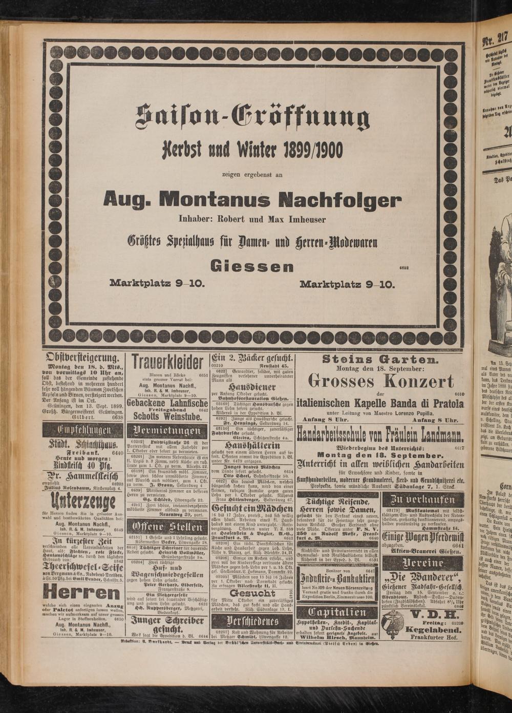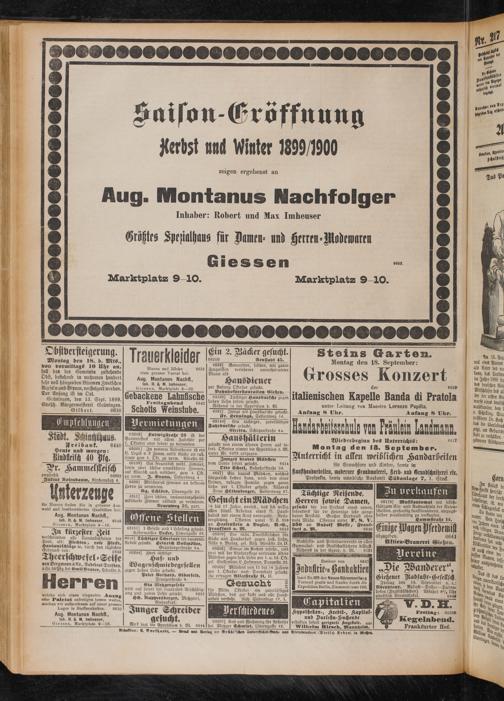 Giessen, Marktplatz 9 — 10, In kürzester Zeit verschwinden alle Unreinlichkeiten der AÜUt; : ?**cht-u, rote Flecke, ÄÄ:e‘ K- bUrd| bC" “■“jg Thee» schwefel. Seife *on Bergmann & Eo., Nadebeul Dresdeu äSt.bQPfg.bci «mtl Bender. Schulstr.ö' Herren wcloho sich einen eleganten Anzag oder Paletot unfertigen lassen wollen, machen wir aufmerksam auf unser grosses