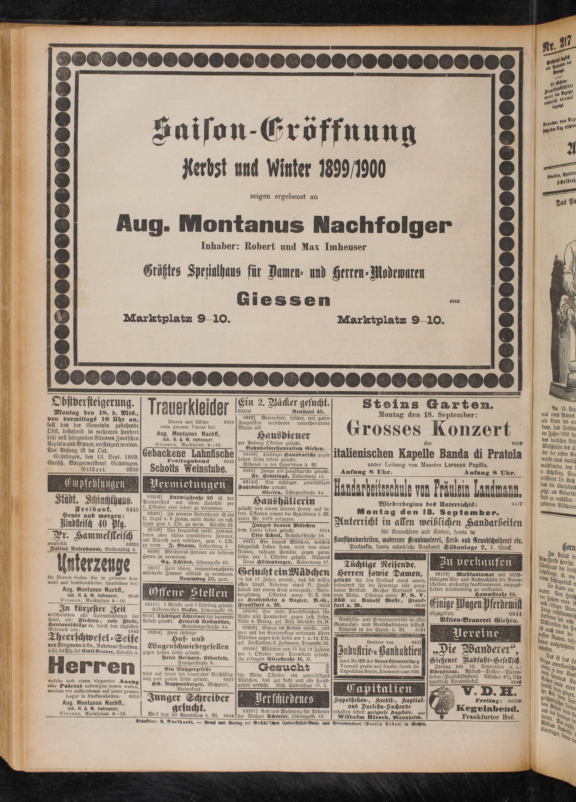 Saison Eröffnung Kerbst und Winter 1899/1900 zeigen ergebenst an