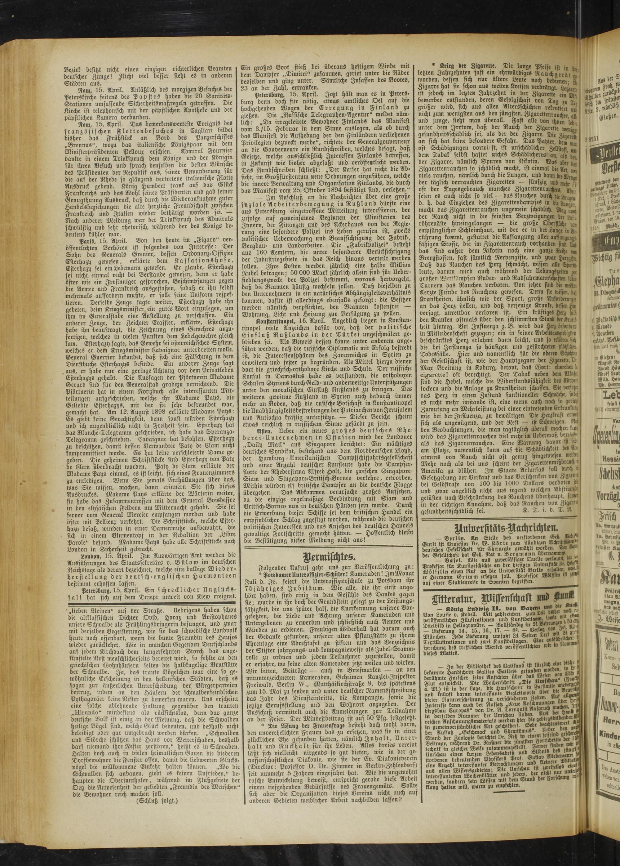 Petersburg, 15. April. Ein schrecklicher Unglücks- fall hat sich auf dem Dniepr unweit von Kiew ereignet. ' „lieben Kleinen" auf der Straße. Uebrigens haben schon die altklassischen Dichter Ovid, Horaz und Aristophanes unsere Schwalbe als Frühlingsbringerin besungen, und zwar mit derselben Begeisterung, wie sie das schwedische Landvolk heute noch offenbart, wenn die bunte Freundin des Hauses | wieder zurückkehrt. Wie in manchen Gegenden Deutschlands ; auf jedem Kirchdach dem langersehnten Storch das ungekünstelte Nest menschlicherscits bereitet wird, so fehlte an den griechischen Wohnhäusern selten die halbkugelige Brutstätte der Schwalbe. Ja, das traute Vögelchen war eine so gewöhnliche Erscheinung in den hellenischen Städten, daß es sogar zur äußerlichen Unterscheidung der Bürgerparteien beitrug, indem an den Häusern der schwalbenfeindlichen Pythagoräer keine Nester zu bemerken waren. Uns erscheint eine solche ablehnende Haltung gegenüber den trauten „Hirundo“ mindestens als rücksichtslos, denn das ganze deutsche Volk ist einig in der Meinung, daß die Schwalben heilige Vögel sind, welche Glück bedeuten, und deshalb nicht beleidigt oder gar umgebracht werden dürfen. „Schwalben und Störche schützen das Haus vor Wetterschaden, deshalb darf niemand ihre Nester zerstören," heißt es in Schwaben. Halten doch auch in vielen heimatlichen Gauen die biederen Dorfbewohner die Fenster offen, damit die liebwerten Glücksvögel die willkommene Einkehr halten können. „Wo die Schwalben sich anbauen, giebt es keinen Unfrieden," behaupten die Oberinnthaler, während im Flußgebiete der Oetz die Anwesenheit der geliebten „Freundin des Menschen" die Bewohner reich machen soll.