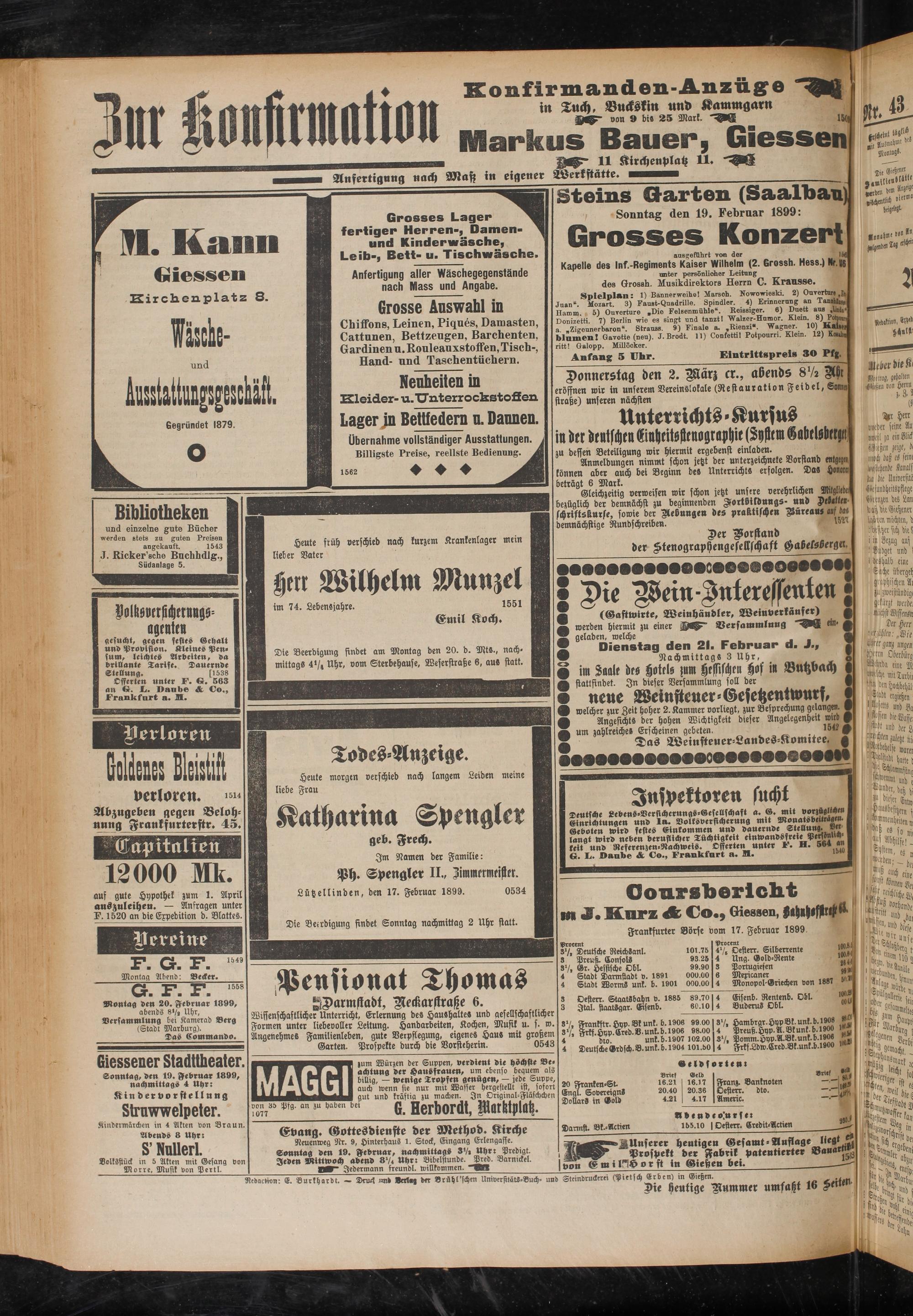 Sonntag, den 19. Februar 1899, nachmittags 4 Uhr: