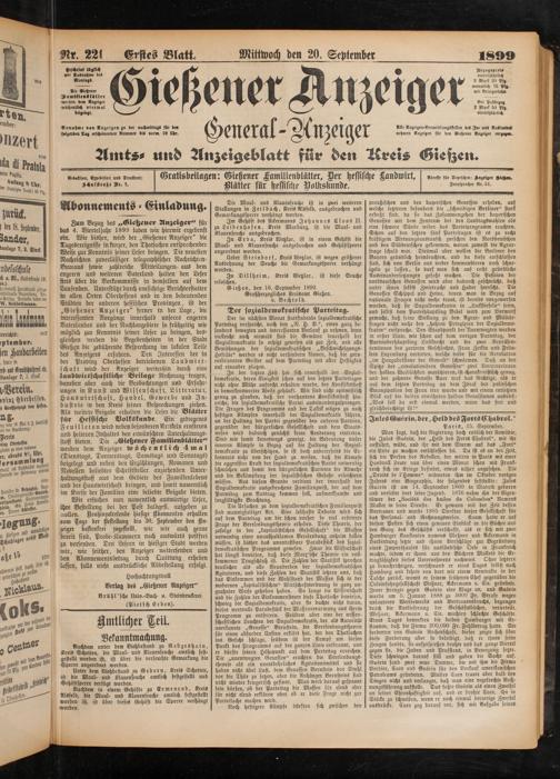 Zum Bezug des „Gietzenev Anzeiger" für das 4. Vierteljahr 1899 laden wir hiermit ergebenst ein. Wie bisher, wird der „Gießener Anzeiger" die Tagesereignisse in kurzer, den Thatsachen entsprechender Weise zur Kenntnis seiner Leser bringen. Die neuesten Nachrichten zuverlässiger telegraphischer Nachrichten- Bureaus sowie zahlreiche Mitteilungen aus dem engeren und weiteren Vaterland halten den Leser stets über die Vorkommnisse in demselben auf dem Laufenden. Unterstützt durch umsichtige Berichterstatter m allen Orten Oberhessens und in den bedeutenden Städten der anderen hessischen Provinzen, ist der „Gießener Anzeiger" ferner in der Lage, die interessanten Vorgänge innerhalb unseres engeren Vaterlandes und der Nachbargebiete so frühzeitig wie möglich zur Kenntnis seiner Leser zu bringen, desgleichen werden die Begebenheiten in der Stadt Gießen die gebührende Besprechung im lokalen Teile des Anzeigers erfahren. Den Interessen der in der Provinz Oberhessen betriebenen Landwirtschaft wird der Anzeiger weiterhin durch eine landwirtschaftliche Beilage Rechnung tragen, daneben aber auch die Beobachtungen und Erfahrungen in Kunst und Wissenschaft, Litteratur, Hauswirtschaft, Handel, Gewerbe und Industrie in den Kreis seiner Besprechungen ziehen. Ms weitere Beigabe erhalten die Leser die Blätter für Hessische Volkskunde. Ein gediegenes Feuilleton wird neben besonderen Artikeln ernsteren und heiteren Inhaltes den erwünschten Unterhaltungsstoff bieten. Die „Gießener Familienblätter" werden dem Anzeiger wöchentlich 4mal (Dienstags, Donnerstags, Samstags und Sonntags) beigelegt und neben den Erzählungen, Romanen und Novellen beliebter Schriftsteller anziehenden Unterhaltungsstoff aus dem Gebiete des Familienlebens und der Hauswirtschaft bringen, und somit namentlich im Kreise der Familien eine beliebte Beigabe bieten.