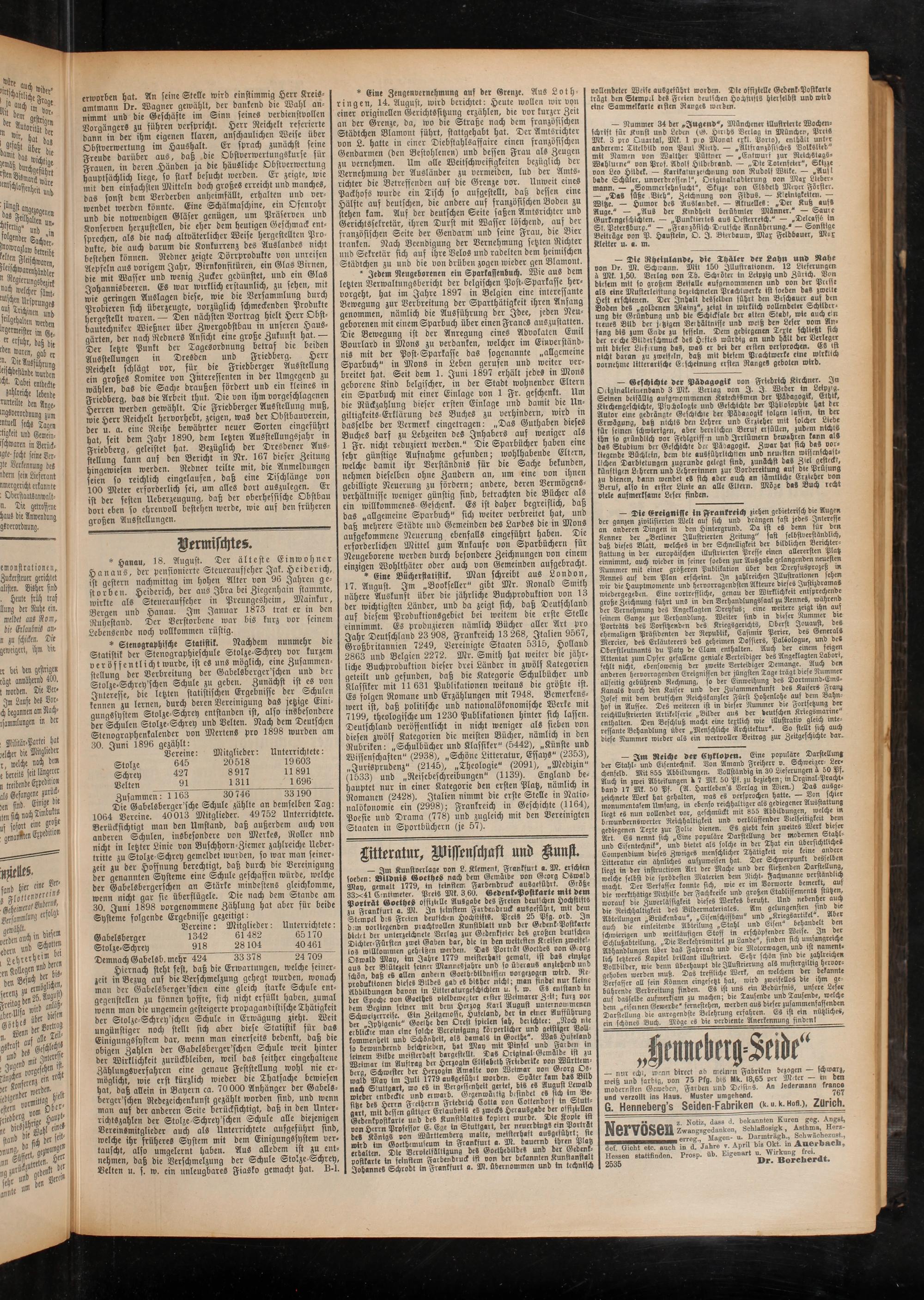 Die Gabelsberger'sche Schule zählte an demselben Tag: 1064 Vereine. 40013 Mitglieder. 49752 Unterrichtete. Berücksichtigt man den Umstand, daß außerdem auch von anderen Schulen, insbesondere von Merkes, Roller und nicht in letzter Linie von Buschhorn-Ziemer zahlreiche lieber; tritte zu Stolze-Schrey gemeldet wurden, so war man seinerzeit zu der Hoffnung berechtigt, daß durch die Vereinigung der genannten Systeme eine Schule geschaffen würde, welche der Gabelsbergerschen an Stärke mindestens gleichkomme, wenn nicht gar sie überflügele. Die nach dem Stande am 30. Juni 1898 vorgenommene Zählung hat aber für beide Systeme folgende Ergebnisse gezeitigt:
