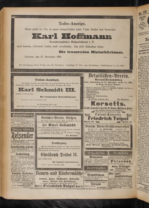 Die Beerdigung findet Freitag den 24. November, vormittags 11 Uhr, vom Sterbehause, Schillerstrasse 5, aus statt.