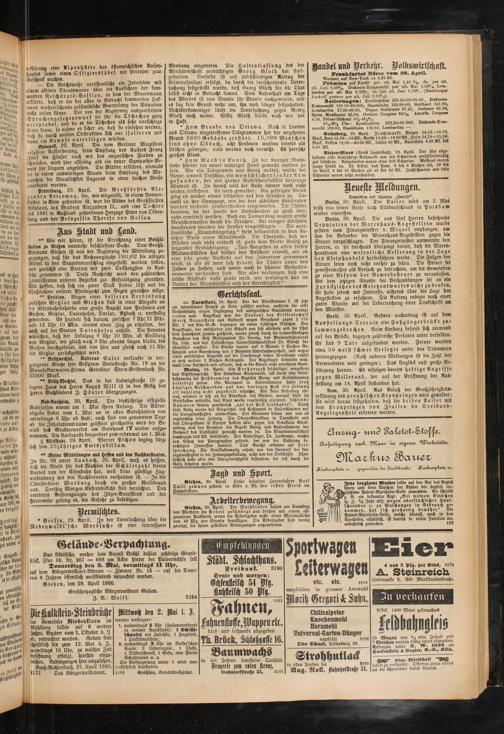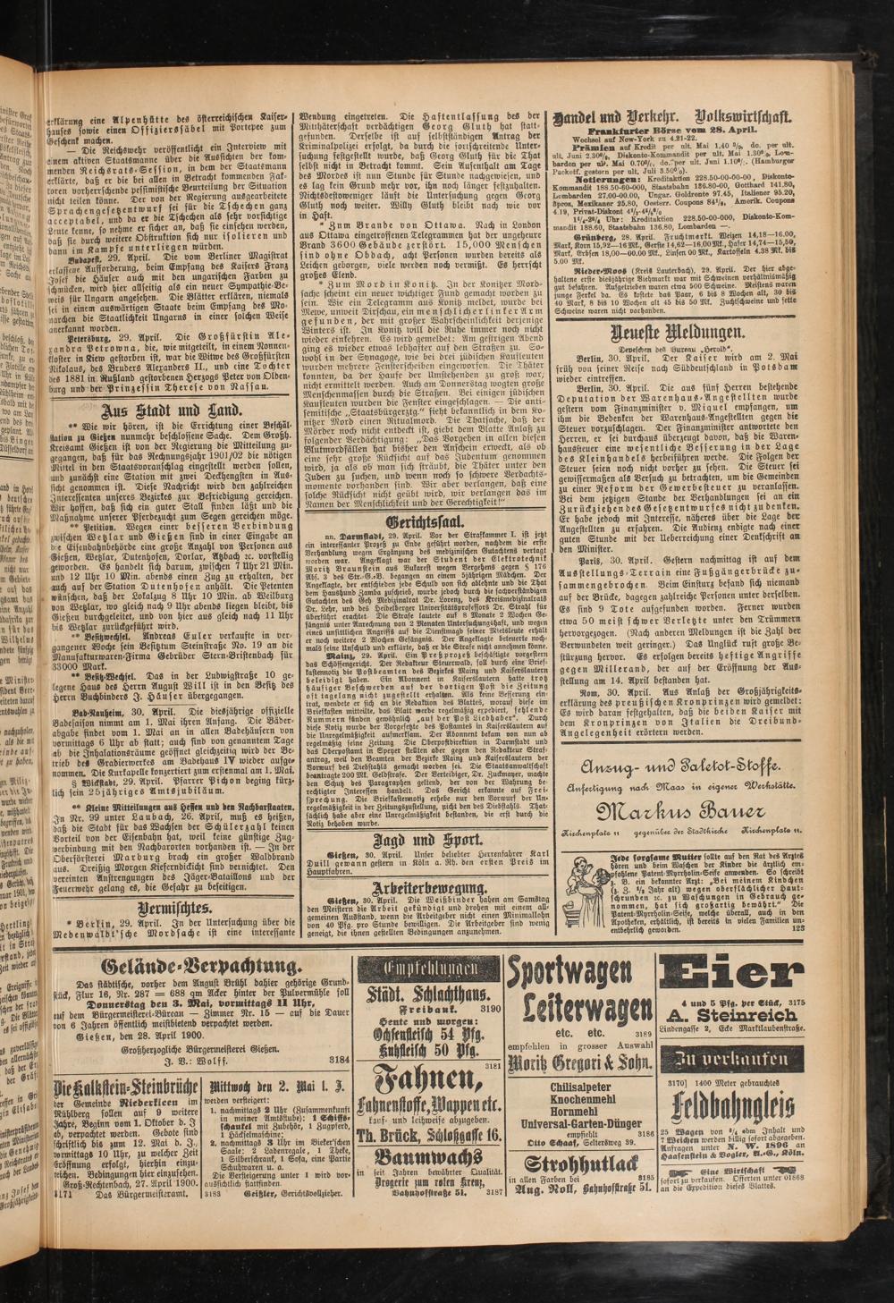 Kleine Mitteilungen aus Hesse« und den Nachbarstaaten. In Nr. 99 unter Laubach, 26. April, muß es heißen, daß die Stadt für das Wachsen der Schülerzahl keinen Vorteil von der Eisenbahn hat, weil keine günstige Zug- verbindung mit den Nachbarorten vorhanden ist. — In der Oberförsterei Marburg brach ein großer Waldbrand aus. Dreißig Morgen Kieferndickicht sind vernichtet. Den vereinten Anstrengungen des Jäger-Bataillons und der Feuerwehr gelang es, die Gefahr zu beseitigen.