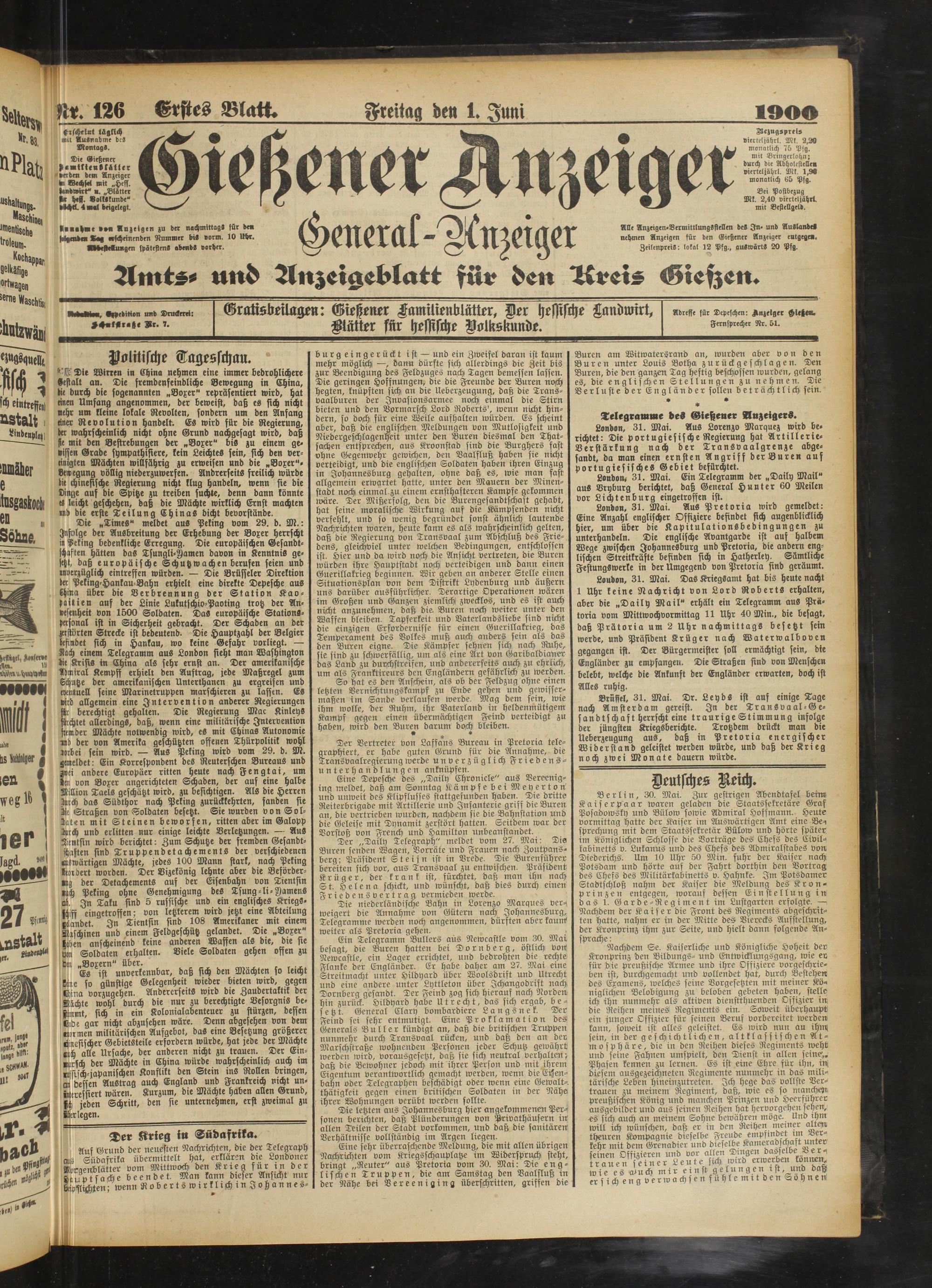 Ein Telegramm Bullers aus Newcastle vom 30. Mai besagt, die Buren hatten bei Dornberg, östlich von. Newcastle, ein Lager errichtet, und bedrohten die rechte Flanke der Engländer. Er habe daher am 27. Mai eine Streitmacht unter Hildyard über Woolsdrift und Utrecht und eine andere unter Lyttleton über Jchangodrift nach Dornberg gesandt. Der Feind zog sich hierauf nach Norden hin zurück. Hildyard habe Utrecht, das sich ergab, besetzt. General Clary bombardiere Langsnek. Der ! Feind sei sehr entmutigt. Eine Proklamation des Generals Buller kündigt an, daß die britischen Truppen nunmehr durch Transvaal rücken, und daß den an der Marschstraße wohnenden Personen jeder Schutz gewährt werden wird, vorausgesetzt, daß sie sich neuttal verhalten; daß die Bewohner jedoch mit ihrer Person und mit ihrem Eigentum verantwortlich gemacht werden, wenn die Eisenbahn oder Telegraphen beschädigt oder wenn eine Gewalt-, thätigkeit gegen einen britischen Soldaten in der Nähe, ihrer Wohnungen verübt werden sollte.