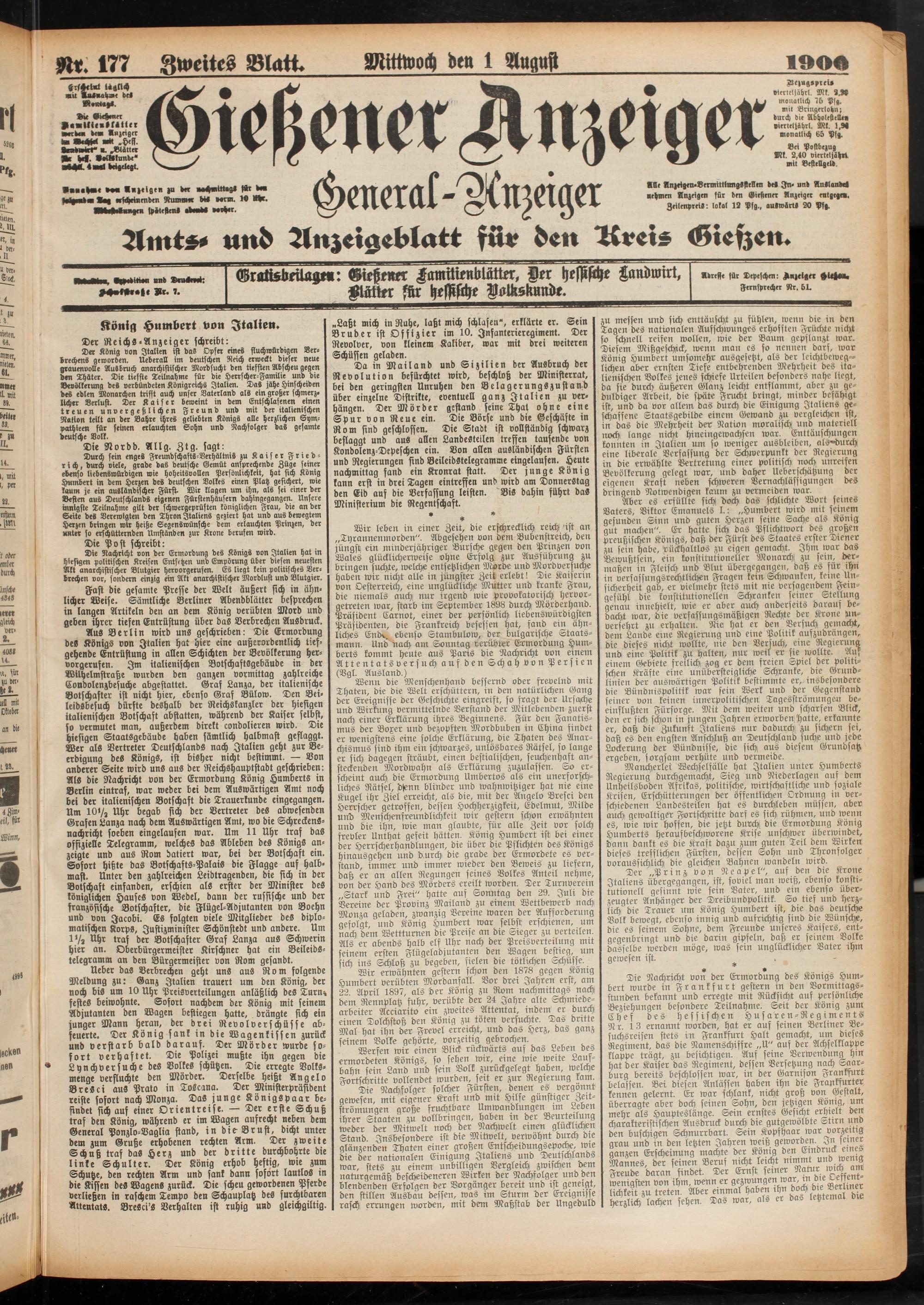 Wenn die Menschenhand bessernd oder frevelnd mit Thaten, die die Welt erschüttern, in den natürlichen Gang der Ereignisse der Geschichte eingreift, so fragt der Ursache und Wirkung vermittelnde Verstand der Mitlebenden zuerst nach einer Erklärung ihres Beginnens. Für den Fanatismus der Boxer und bezopften Mordbuben in China findet er wenigstens eine solche Erklärung, die Thaten des Anarchismus sind ihm ein schwarzes, unlösbares Rätsel, so lange er sich dagegen sträubt, einen bestialischen, seuchenhaft ansteckenden Mordwahn als Erklärung zuzulassen. So erscheint auch die Ermordung Umbertos als ein unerforschi- liches Rätsel, dsenn blinder und wahnwitziger hat nie eine Kugel ihr Ziel erreicht, als die, mit der Angelo Bresci den Herrscher getroffen, dessen Hochherzigkeit, Edelmut, Milde und Menschenfreundlichkeit wir gestern schon erwähnten und die ihn, wie man glaubte, für alle Zeit vor solch frevler Unthat gefeit hätten. König Humbert ist bei einer der Herrscherhandlungen, die über die Pflichten des Königs hinausgehen und d.urch die grade der Ermordete es verstand, immer und immer wieder den Beweis zu liefern, daß er an allen Regungen seines Volkes Anteil nehme, von der Hand des Mörders ereilt worden. Der Turnverein „Stark und Frei" hatte auf Sonntag den 29. Juli die Vereine der Provinz Mailand zu einem Wettbewerb nach Monza geladen, zwanzig Vereine waren der Aufforderung gefolgt, und König Humbert war selbst erschienen, um nach dem Wettturnen die Preise an die Sieger zu verteilen. Als er abends halb elf Uhr nach der Preisverteilung mit seinem ersten Flügeladjutanten den Wagen bestieg, um sich ins Schloß zu begeben, fielen die tötlichen Schüsse.