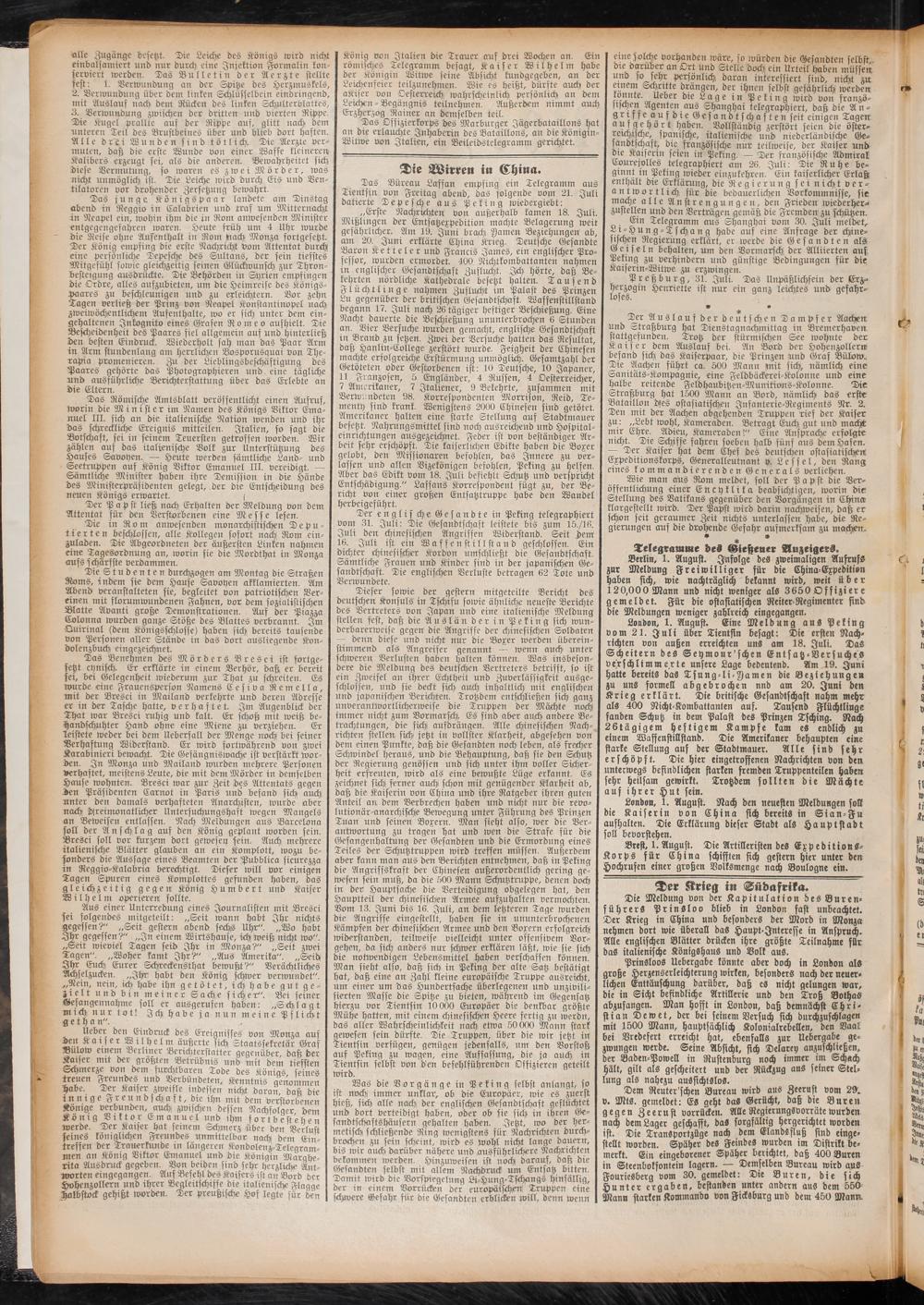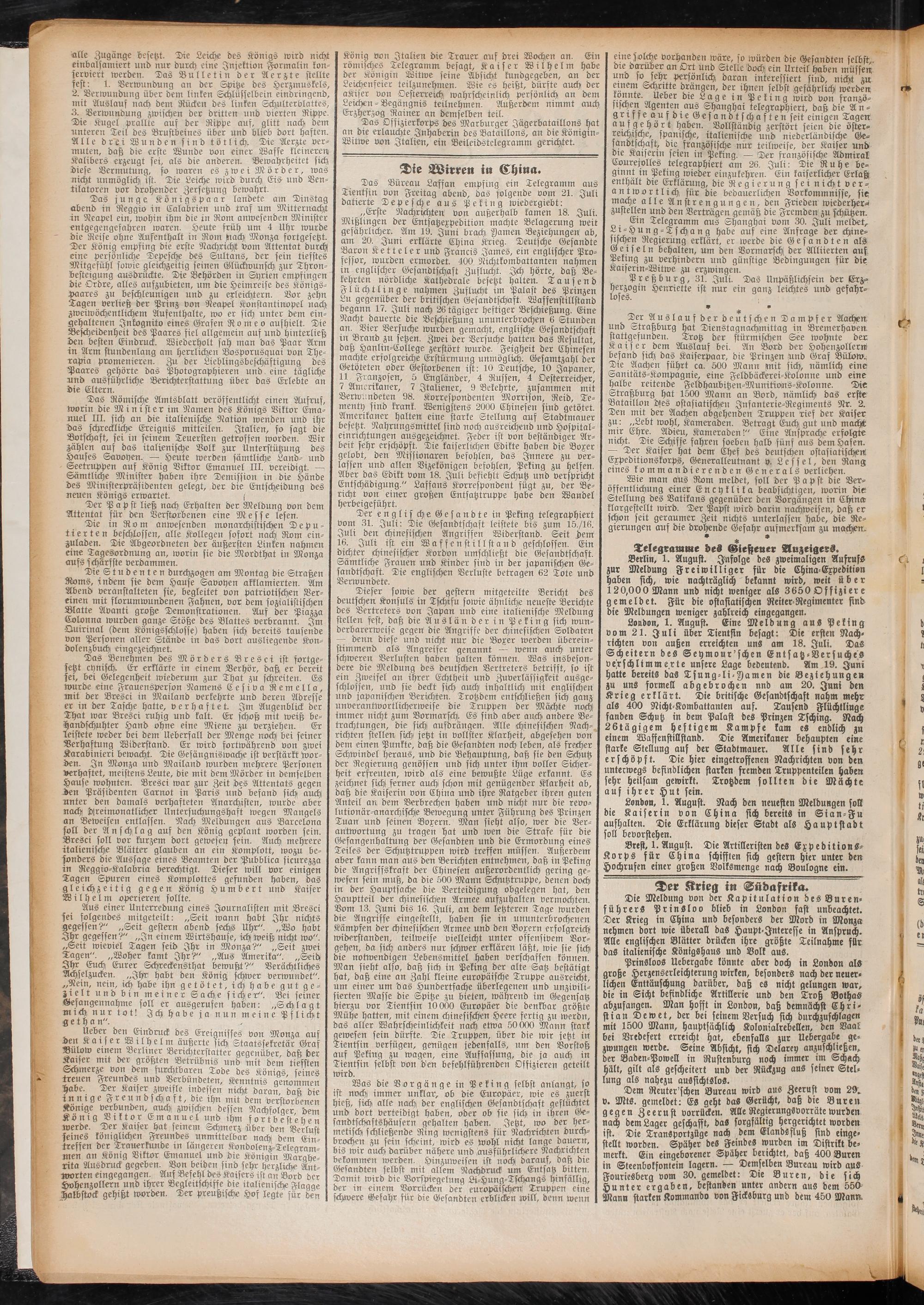 Die Meldung von der Kapitulation des Bure n- führerS PrinSloo blieb in London fast unbeachtet. Der Krieg in China und besonders der Mord in Monza nehmen dort wie überall das Haupt-Jnteresse in Anspruch. Alle englischen Blätter drücken ihre größte Teilnahme für das italienische Königshaus und Volk aus.