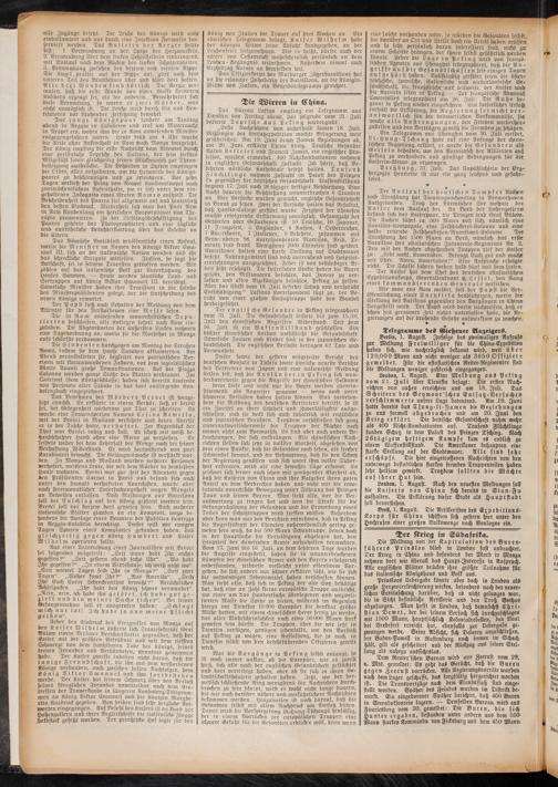 „Erste Nachrichten von außerhalb kamen 18. Juli. Mißlingen der Entsatzexpedition machte Belagerung weit gefährlicher. Am 19. Juni brach, Damen Beziehungen ab, am 20. Juni erklärte China Krieg. Deutsche Gesandte Baron Ketteler und Francis James, ein englischer Professor, wurden ermordet. 400 Nichtkombattanten nahmen in englischer Gesandtschaft Zuflucht. Ich hörte, daß Bekehrten nördliche Kathedrale besetzt halten. Tausend Flüchtlinge nahmen Zuflucht im Palast des Prinzen Lu gegenüber der britischen Gesandtschaft. Waffenstillstand begann 17. Juli nach 26 tägiger heftiger Beschießung. Eine Nacht dauerte die Beschießung ununterbrochen 6 Stunden an. Vier Versuche wurden gemacht, englische Gesandtschaft in Brand zu setzen. Zwei der Versuche hatten das Resultat, daß Hanlin-College zerstört wurde. Feigheit der Chinesen machte erfolgreiche (Ästürmung unmöglich. Gesamtzahl der Getöteten oder Gestorbenen ist: 10 Deutsche, 10 Japaner, 11 Franzosen, 5 Engländer, 4 Russen, 4 Oesterreicher, 7 Amerikaner, 7 Italiener, 9 Bekehrte, zusammen mit Verwendeten 98. Korrespondenten Morrison, Reid, Te- menty sind krank. Wenigstens 2000 Chinesen sind getötet. Amerikaner halten eine starke Stellung auf Stadtmauer besetzt. Nahrungsmittel sind noch ausreichend und Hospital- einrichtungen ausgezeichnet. Feder ist von beständiger Arbeit sehr erschöpft. Die kaiserlichen Edikte haben die Boxer gelobt, den Missionaren befohlen, das Innere zu verlassen und allen Vizekönigen befohlen, Peking zu helfen. Aber das Edikt vom 18. Juli befiehlt Schutz und verspricht Entschädigung." Laffans Korrespondent fügt zu, der Bericht von einer großen Entsatztruppe habe den Wandel herbeigeführt.