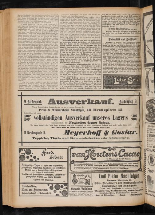 ** Karl Zöppritz. In den ersten Tagen des Oktober starb in Mergelstetten in Württemberg der Gey. Kommerzienrat Zöppritz, der auch Verwandte in Gießen zurückgelassen hat. Karl Zöppritz war am 26. April 1812 in Darmstadt geboren als der 6. von 7 Brüdern aus einer lang dort eingebürgerten hochangesehenen Kaufmannsfamilie. Diese war durch nahe verwandschaftlrche Bande verknüpft mit der Familie des Litteraturhistvrikers Georg Gottfried Gervinus, der mit seinem um wenige Jahre jüngeren Vetter Karl Z. in lebenslanger, inniger Freundschaft verbunden war, wie er denn z. B. einen Teil seiner „Geschichte der poetischen Rationallitteratur der Deutschen" im Hause des Verstorbenen schrieb. Letzterer trat, nachdem er zu seiner Ausbildung längere Zeit im Ausland, besonders in Frankreich, sich aufgehalten, im Jahre 1834 in das elterliche Tuchgeschäft zu Darmstadl ein und gründete 1835 seinen Hausstand mit Margarethe Sofie, Tochter des großherzogl. Hofgerichtsadvokaten Weidenbusch. Gern wandten sich die Gedanken und Erinnerungen des Greises auf jene Darmstädter Jugendepoche zurück. 1847 wurde Z. als Abgeordneter in die Zweite Stände- kammer des Großherzogtums Hessen gewählt und verschaffte sich durch das Gewicht seiner Persönlichkeit bald eine einflußreiche, bedeutende Stellung. Keine Verhandlung in jenen nicht blos für Hessen, sondern für ganz Deutschland so wichtigen Jahren 1847/49 war, an der der Verstorbene sich nicht aktiv beteiligt hätte. So hat er nicht nur als Berichterstatter des Ersten Ausschusses der Kammer einen umfangreichen, 230 Druckseiten umfassenden Bericht über die hessische Finanzverwaltung der Jahre 1842/44 verfaßt und vorgetragen, sondern namentlich eine ganze Reihe von Initiativanträgen gestellt, die sich durch klares Erfassen der Volksbedürfnisse und edlen Liberalismus auszeichneten. Wir heben unter denselben als be sonders bedeutsam den von dem Verstorbenen am 13. April 1849 gestellten Antrag hervor, durch den er auch in die Geschicke des großen deutschen Vaterlandes aktiv eingriff: