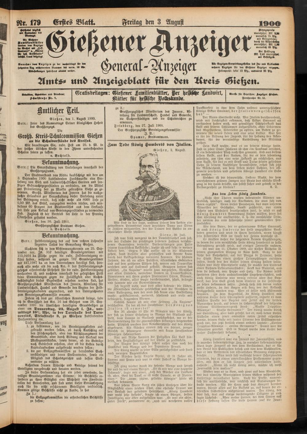 Am 30. abends 10 Uhr 30 Minuten war der König, der sich zu seiner Erholung in Monza bei Mailand aufhielt, vom Campo in Mailand zurückgekehrt, wo er der Preisverteilung für die gymnastischen Uebungen beigewohnt hatte. Plötzlich wurden drei Revolverschüsse auf den König abgefeuert.' Als Mörder erwies sich ein dürrer, junger Mensch in schwarzem Gewände mit kaum sprossendem schwarzen Schnurrbart.