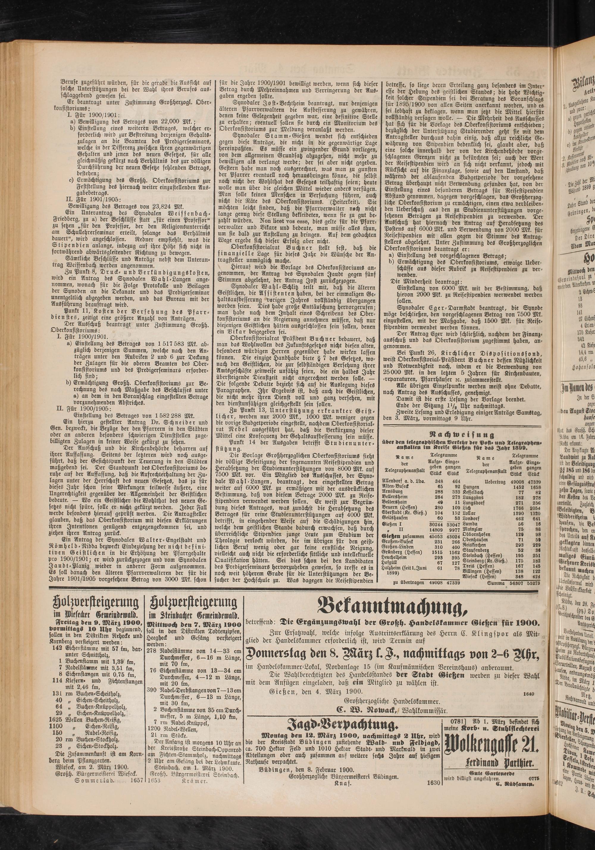 Montag deu 12. März 1900, nachmittags 2 Uhr, wird die der Kreisstadt Büdingen zustehende Wald- und Feldjagd, ca. 700 Hektar Feld und 1010 Hektar Stadt- und Markwaid in zwei Abteilungen oder auch zusammen auf weitere sechs Jahre auf hiesigem Rathause verpachtet.