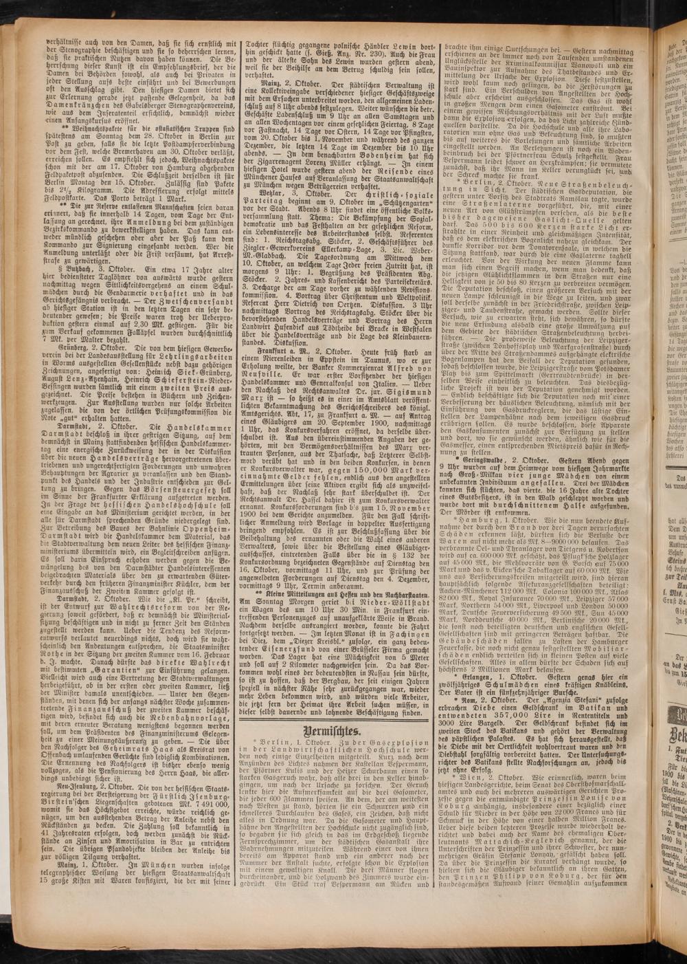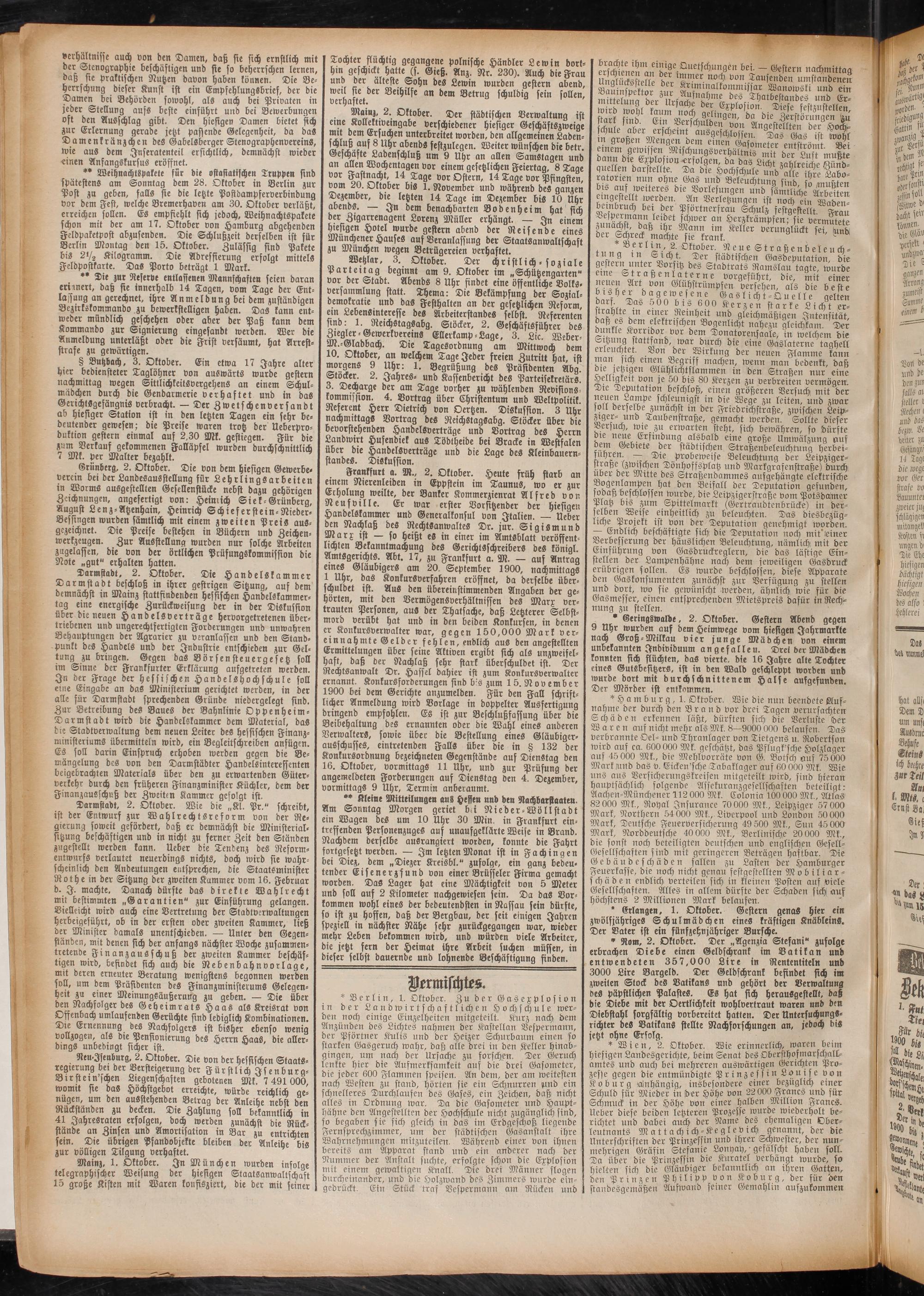 Geschäfte Ladenschluß um 9 Uhr an allen Samstagen und I an allen Wochentagen vor einem gesetzlichen Feiertag, 8 Tage I vor Utnacht, 14 Tage vor Ostern, 14 Tage vor Pfingsten, I vom 20. Oktober bis 1. November und während des ganzen I Dezember, die letzten 14 Tage im Dezember bis 10 Uhr I abends. — In dem benachbarten Bodenheim hat sich der Zigarrenagent Lorenz Müller erhängt. — In einem I Affigen Hotel wurde gestern abend der Reisende eines I Münchener Hauses auf Veranlassung der Staatsanwaltschaft I ZU München wegen Betrügereien verhaftet.