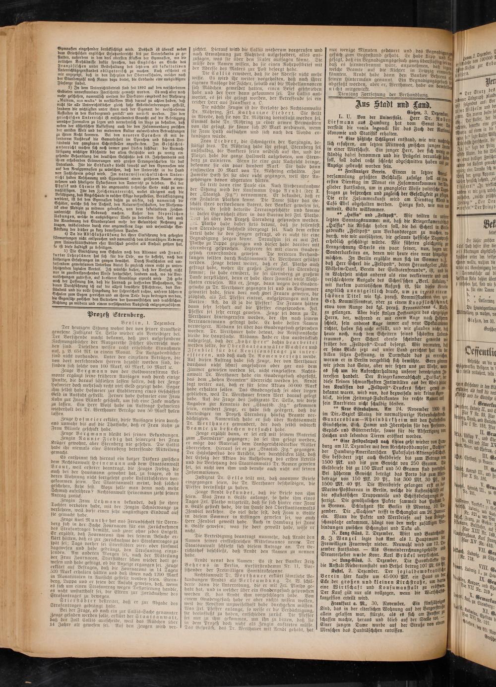 Frankfurt a. M., 30. November. Ein fünfjährige Kind, das in der elterlichen Wohnung auf der Bergerstrap allein gelassen war, stürzte, als es sich am Fensters schaffen machte, heraus und blieb auf der Stelle tot. Einer jungen Dame wurde auf der Straße von etll Menschen das Handtäschchen entrissen.