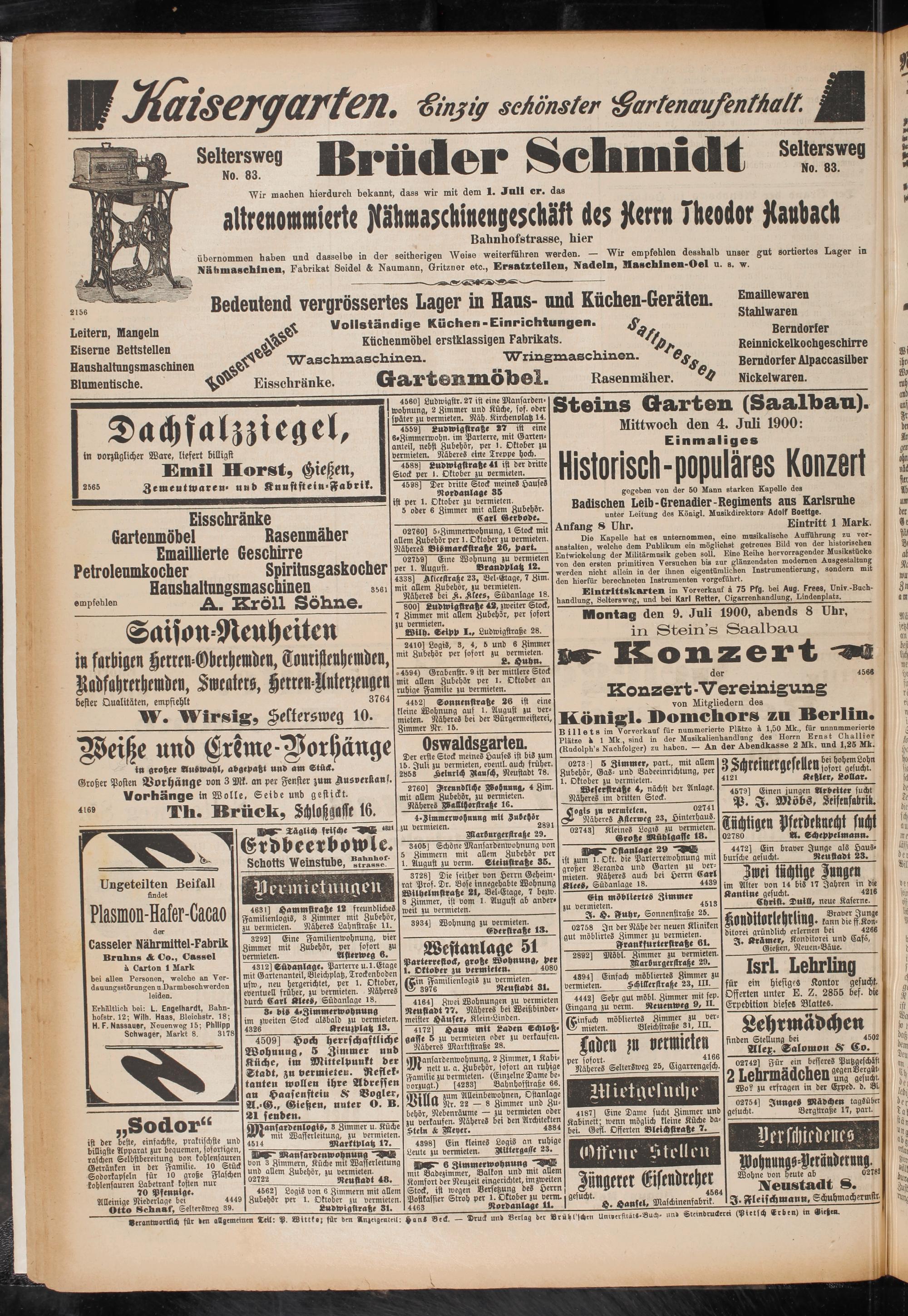 Montag den 9. Juli 1900, abends 8 Uhr, in Stein’s Saalbau sr Konzert -oe der 4566