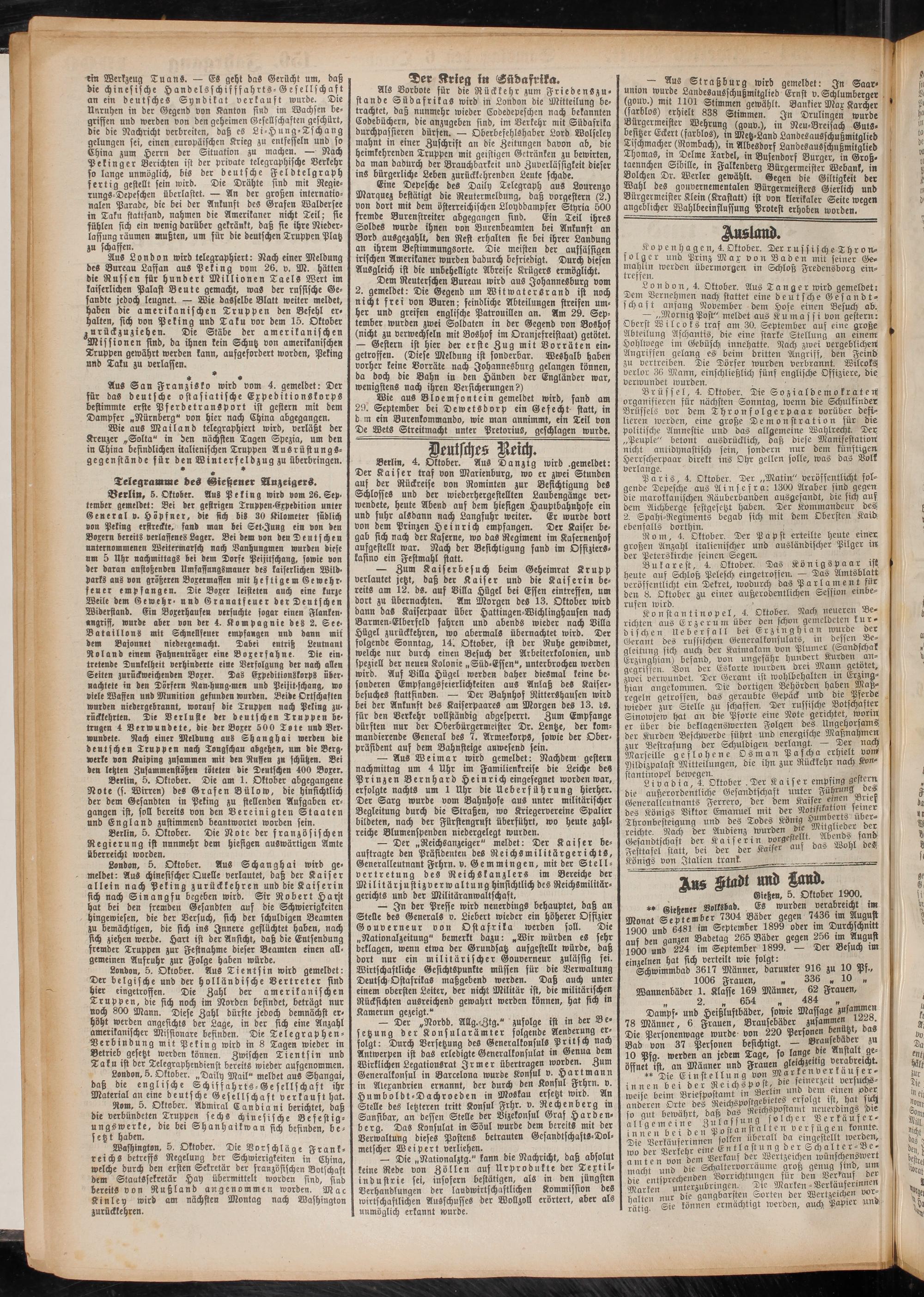 Dem Reuterschen Bureau wird aus Johannesburg vom 2. gemeldet: Die Gegend um Witwatersrand ist noch nicht frei von Buren; feindliche Abteilungen streifen umher und greifen englische Patrouillen an. Am 29. September wurden zwei Soldaten in der Gegend von BoShos (nicht zu verwechseln mit Boshos im Oranjefreistaat) getötet. — Gestern ist hier der erste Zug mit Vorräten eingetroffen. (Diese Meldung ist sonderbar. Weshalb haben vorher keine Vorräte nach Johannesburg gelangen können, da doch die Bahn in den Händen der Engländer war, wenigstens nach ihren Versicherungen?)