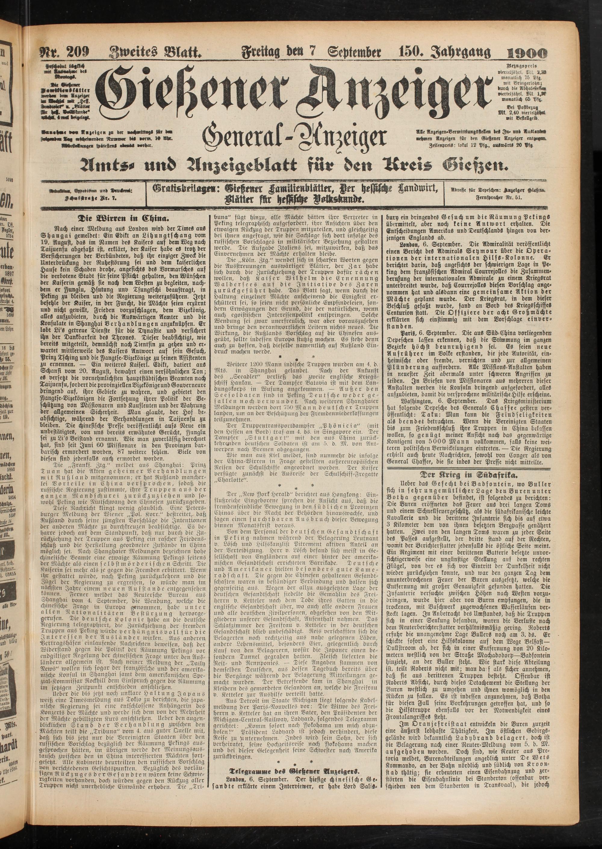 Washington, 6. September. Das Kriegsministerium hat folgende Depesche des Generals Chaffee gestern veröffentlicht: Taku: Man kann die Feindseligkeiten als beendet betrachten. Wenn die Vereinigten Staaten bis zum Friedensschluß ihre Truppen in China belassen wollen, so genügt meiner Ansicht nach das gegenwärtige Kontigent von 5000 Mann vollkommen, falls keine weiteren politischen Verwickelungen eintreten. — Die Regierung erhielt auch heute Nachrichten, sowohl von Conger als von General Chaffee, die sie indes der Presse nicht mitteilte.