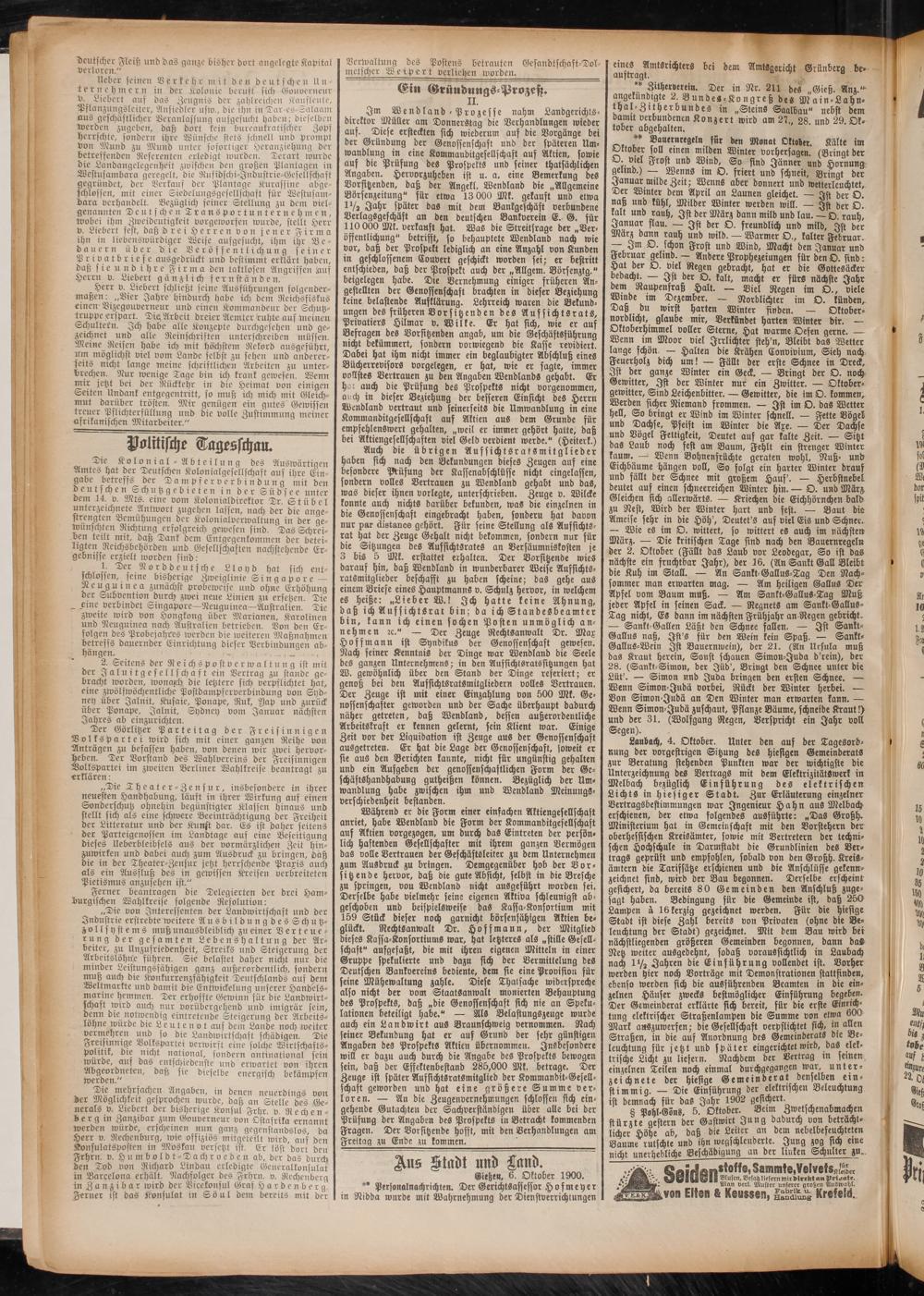 Im Wendland-Prozesse nahm Landgerichls- direktor Müller am Donnerstag die Verhandlungen wieder aus. Diese ersteckten sich wiederum aus die Vorgänge bei der Gründung der Genossenschaft und der späteren Umwandlung in eine Kommanditgesellschaft aus Aktien, sowie auf die Prüfung des Prospekts und seiner thatsächlichen Angaben. Hervorzuheben ist u. a. eine Bemerkung des Vorsitzenden, daß der Angekl. Wendland die „Allgemeine Börsenzeitung^ für etwa 13 000 Mk. gekauft und etwa IV2 Jahr später das mit dem Bankgeschäft verbundene Verlagsgeschäst an den deutschen Bankverein E. G. für 110 000 Mk. verkauft hat. Was die Streitfrage der „Veröffentlichung" betrifft, so behauptete Wendland nach wie vor, daß der Prospekt lediglich an eine Anzahl von Kunden in geschloffenem Couvert geschickt worden sei; er bestritt entschieden, daß der Prospekt auch der „Allgem. Börsenztg." beigelegen habe. Die Vernehmung einiger früheren Angestellten der Genossenschaft brachten in dieser Beziehung keine belastende Aufklärung. Lehrreich waren die Bekundungen des früheren Vorsitzenden des Aussichtsrats, Privatiers Hilmar v. Wilke. Er hat sich, wie er auf Befragen des Vorsitzenden angab, um die Geschäftsführung nicht bekümmert, sondern vorwiegend die Kasse revidiert. Dabei hat ihm nicht immer ein beglaubigter Abschluß eines Bücherrevisors vorgelegen, er hat, wie er sagte, immer vollstes Vertrauen zu den Angaben Wendlands gehabt. Er har auch die Prüfung des Prospekts nicht vorgenommen, avch in dieser Beziehung der besseren Einsicht des Herrn Wendland vertraut und seinerseits die Umwandlung in eine Kommanditgesellschaft auf Aktien aus dem Grunde für empfehlenswert gehalten, „weil er immer gehört hatte, daß bei Aktiengesellschaften viel Geld verdient werde." (Heiterk.)