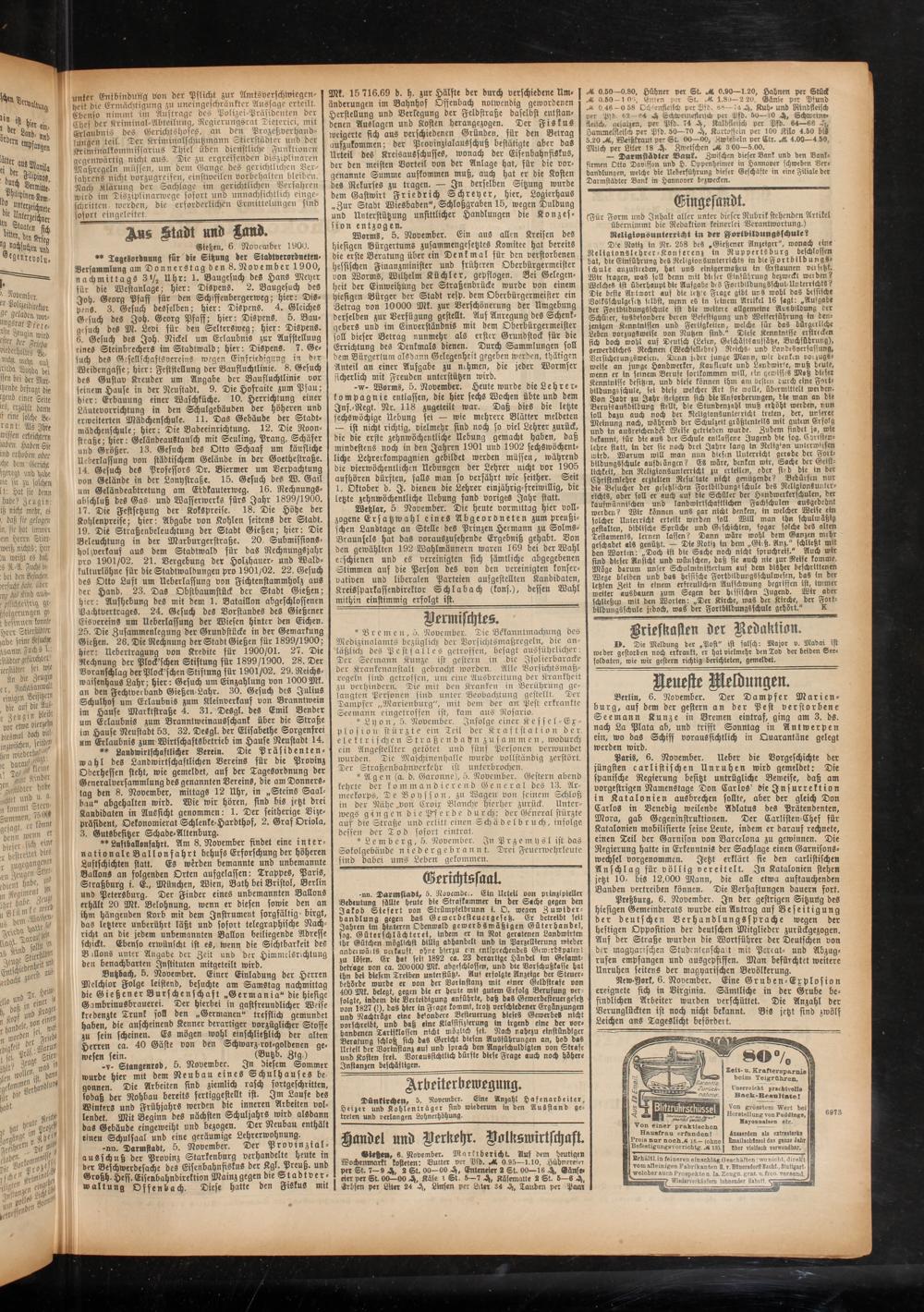 Worms, 5. November. Ein aus allen Kreisen des hiesigen Bürgertums zusammengesetztes Komitee hat bereits die erste Beratung über ein Denkmal für den verstorbenen hessischen Finanzminister und früheren Oberbürgermeister von Worms, Wilhelm Küchler, gepflogen. Bei Gelegenheit der Einweihung der Straßenbrücke wurde von einem hiesigen Bürger der Stadt resp. dem Oberbürgermeister ein Betrag von 1OOOO Mk. zur Verschönerung der Umgebung derselben zur Verfügung gestellt. Auf Anregung des Schenkgebers und im Einverständnis mit dem Oberbürgermeister soll dieser Betrag nunmehr als erster Grundstock für die Errichtung des Denkmals dienen. Durch Sammlungen soll dem Bürgerrum alsdann Gelegenheit gegeben werden, thätigen Anteil an einer Aufgabe zu nahmen, die jeder Wormser sicherlich mit Freuden unterstützen wird.